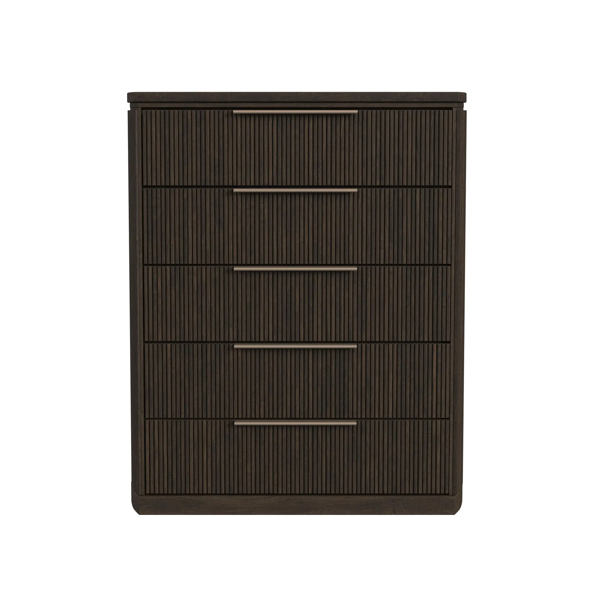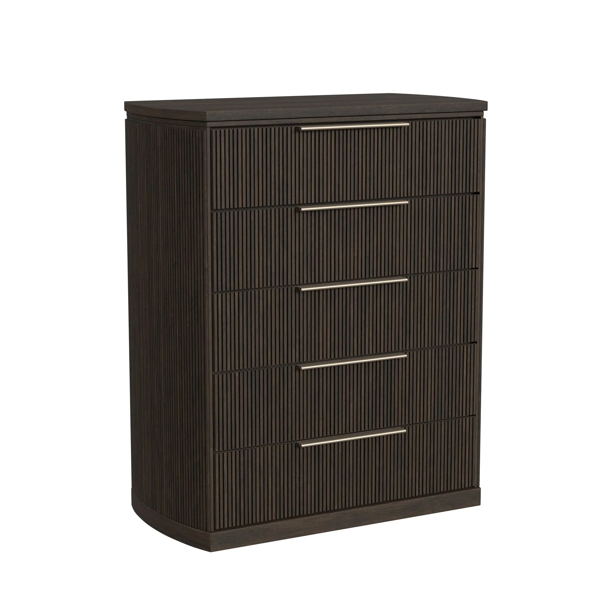The Sylvie 5-Drawer Chest in Dark Brown is a refined addition to your bedroom. Outfitted with fine decorative fluting and sleek, understated silver drawer pulls, the elegance of this piece is only matched by its quality construction. Each drawer features skillful dovetailing and smoothly operating ball bearing glides, while the top drawer specifically is thoughtfully fitted with felt lining. For a piece that is as durable as it is elegant, the Sylvie 5-Drawer Chest in Dark Brown is sure to please.