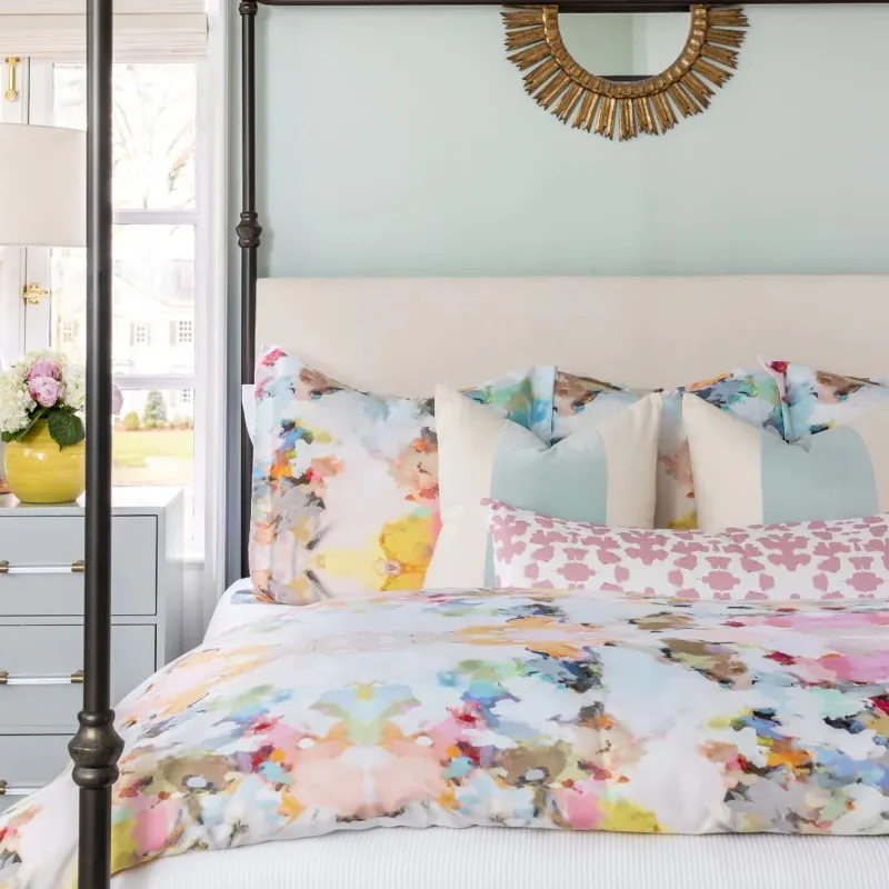 Inspired by Laura's original art, our colorful duvet covers offer a unique and artistic touch to any bedroom! Pair with our matching shams for a bold statement or simplify with our white scalloped shams with a colored piping for an elegant look.