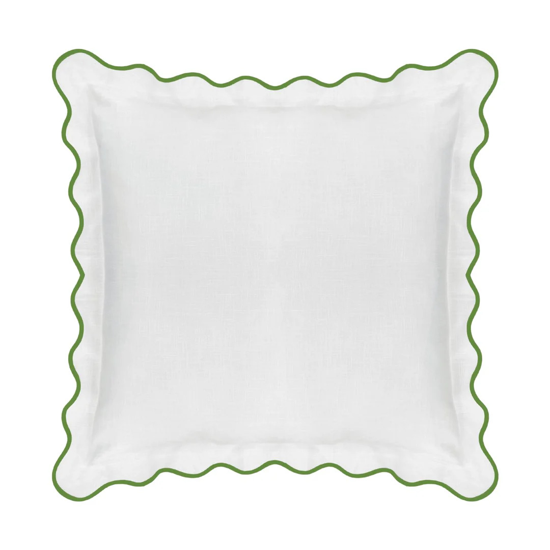 The perfect blank canvas. These scalloped euro shams are an elegant addition to any bed, perfect for layering with our vibrant patterns. The soft white fabric features a green piped edge, offering a cohesive, classic look.