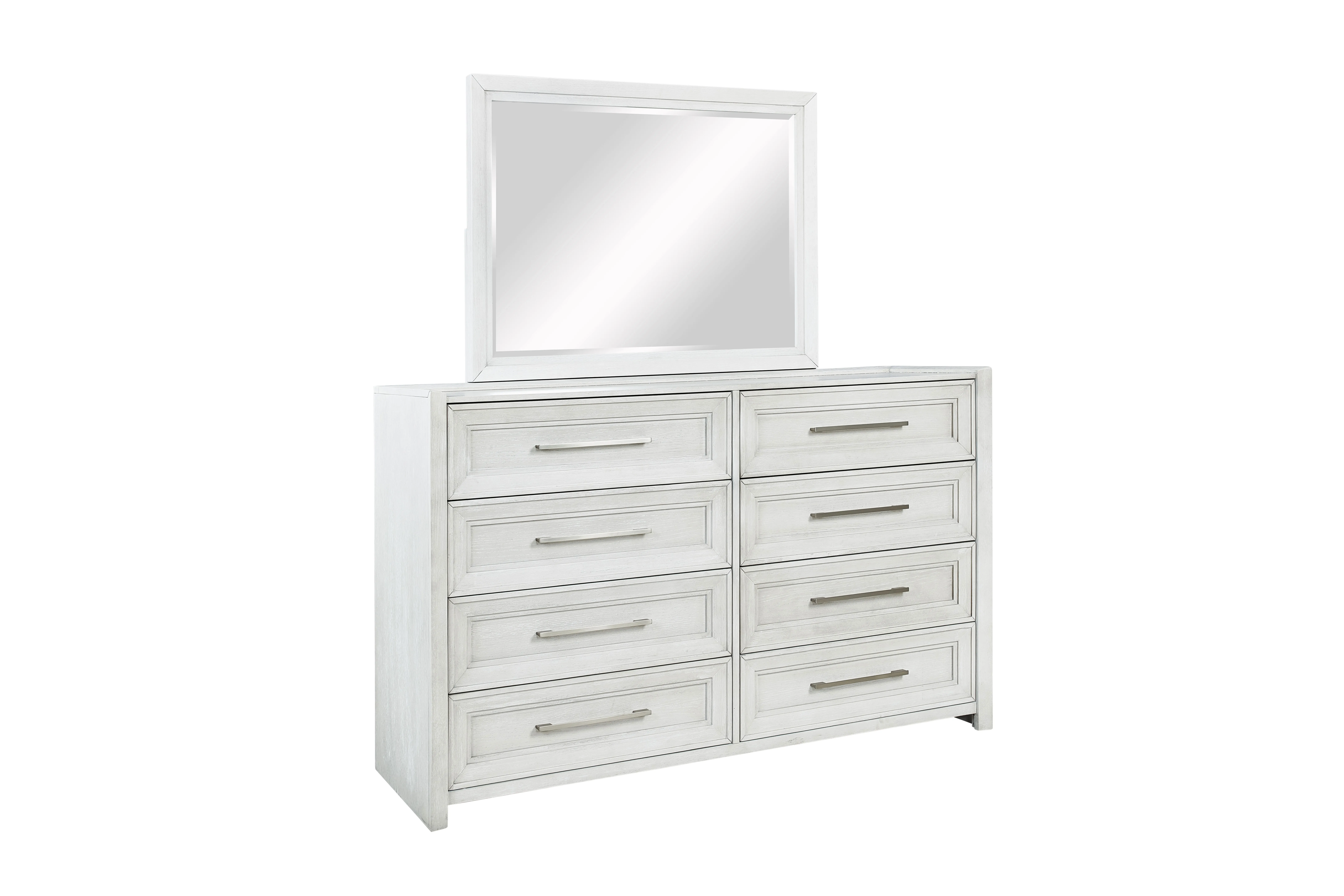 • Casual Contemporary Bedroom Constructed Of Rubber Wood Solids And Straight Grain Oak Veneers In A Brushed White Finish With Cob Led Lights On All Pieces.