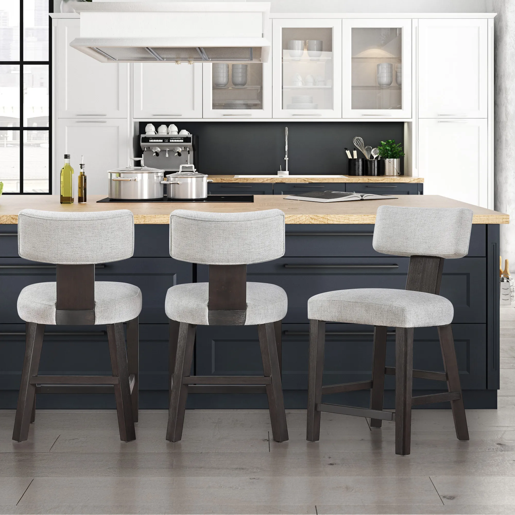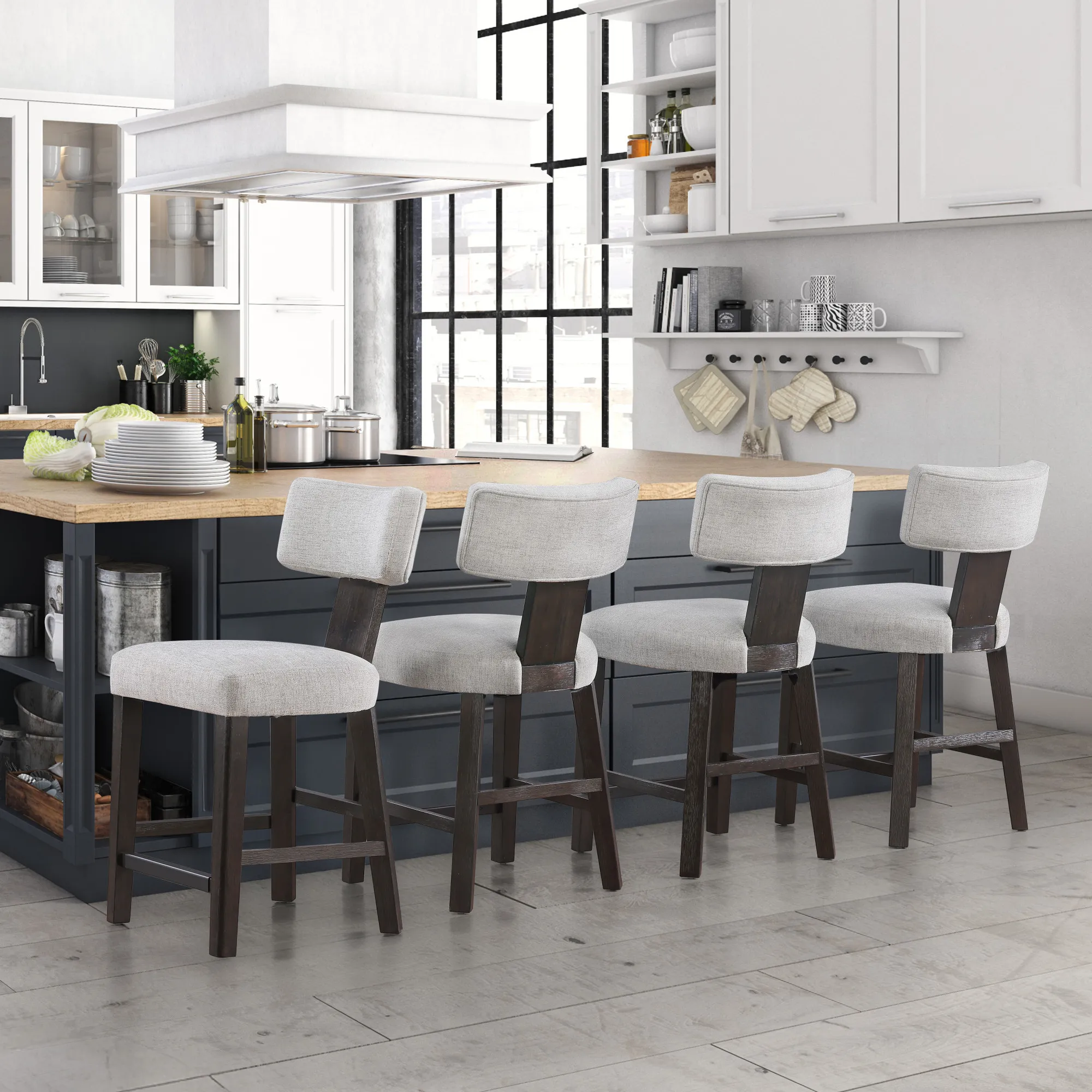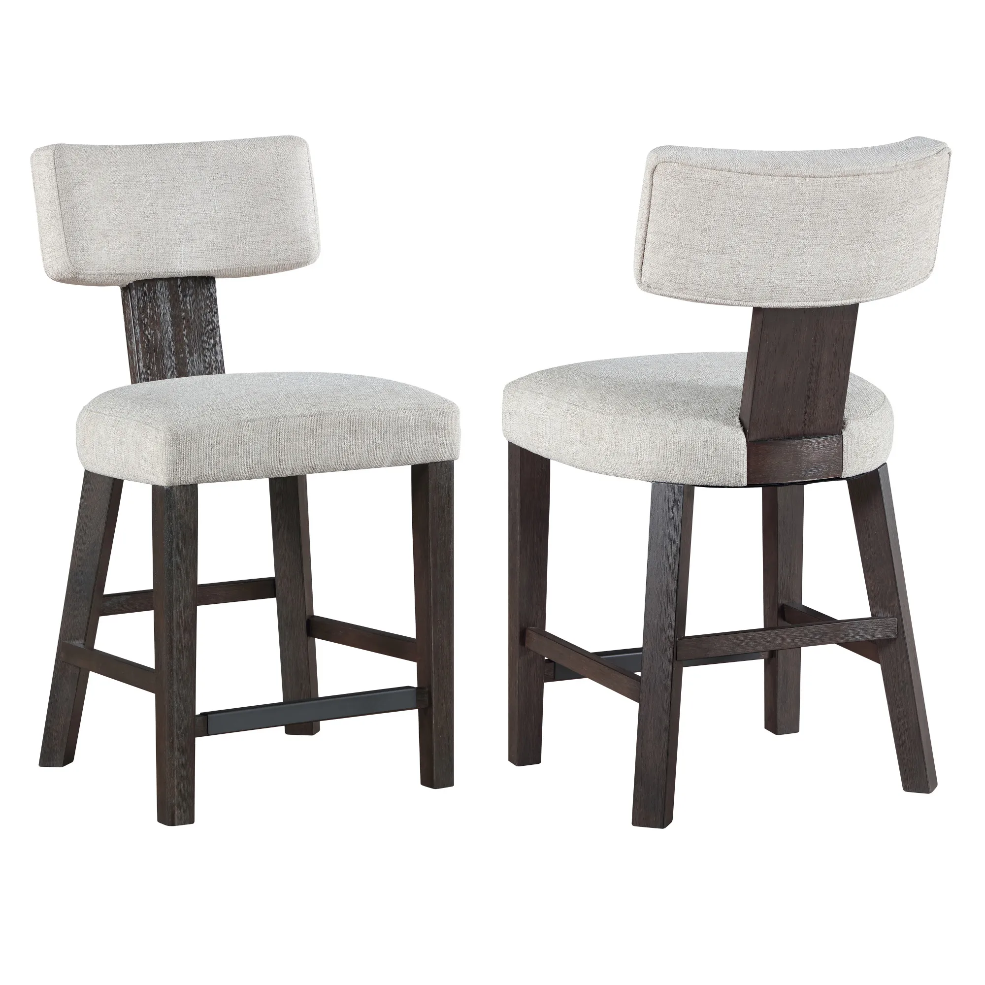 A floating barrel-style backrest, supported by exposed wood posts, combines ergonomic support with visual appeal. The 5.5" thick seat cushion, upholstered in light gray herringbone polyester, offers plush comfort for everyday use. Reinforced front and side stretchers enhance durability and double as a convenient footrest. Finished in a rich charcoal brown, Oakley brings modern style, lasting comfort, and smart functionality to any kitchen or dining space.
