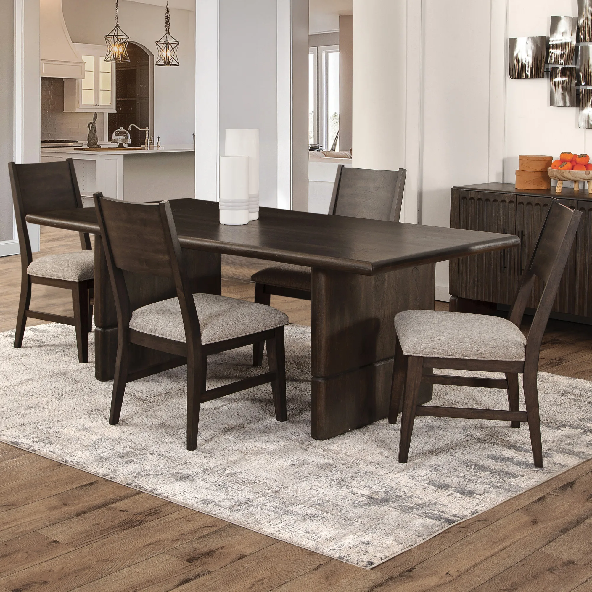 The 5-piece Norvell Dining Set pairs clean lines and rich finishes for timeless appeal. At the center is a 78" solid wood table with a bullnose edge and notched double pedestal base, offering durability and style. Four cushioned side chairs provide everyday comfort with a tailored look. A dark espresso finish adds warmth and elegance to any dining space. With its transitional design and balanced scale, the Norvell set delivers both function and sophistication—perfect for casual meals or formal gatherings.