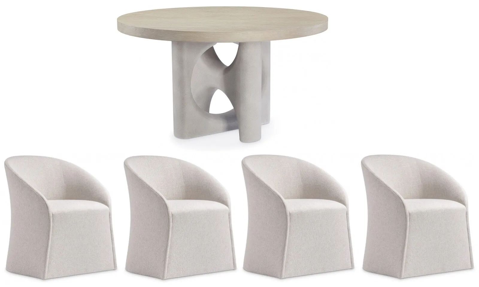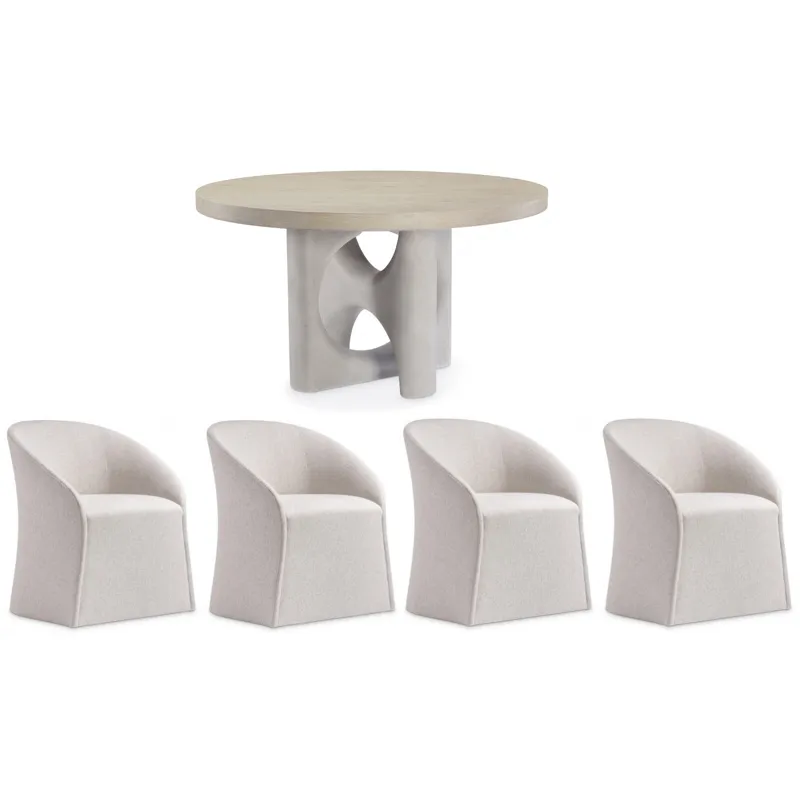 Antibes Dining Table (K2047): 54 x 54 x 30 - An interlocking sculptural base makes an artistic statement on the Antibes dining table. Bisecting circles and curves are crafted from a textural glass-reinforced concrete in Pumice finish. The base contrasts beautifully with a round wood top in the rustic Roz finish.