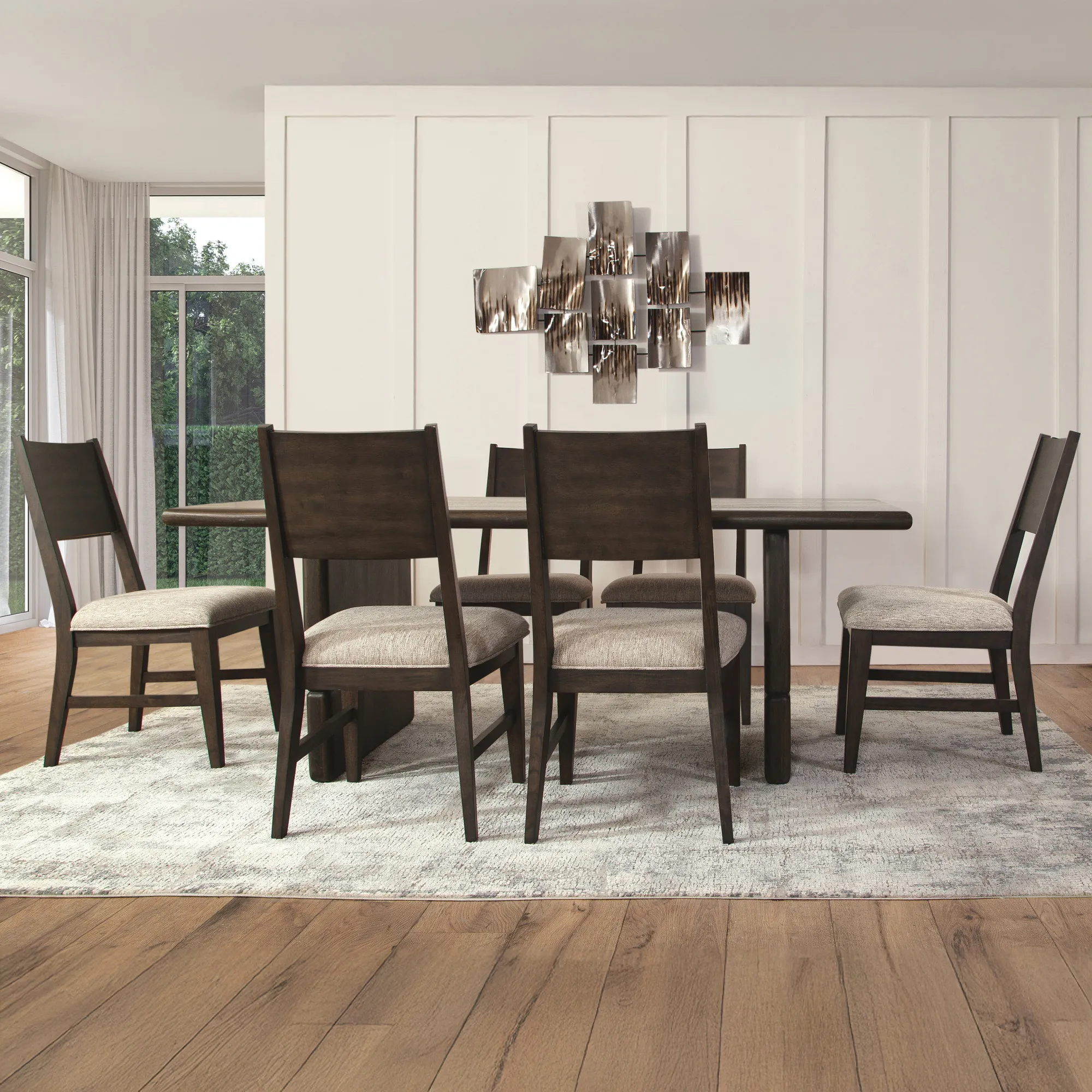 The 7-piece Norvell Dining Set pairs clean lines and rich finishes for timeless appeal. At the center is a 78" solid wood table with a bullnose edge and notched double pedestal base, offering durability and style. Six cushioned side chairs provide everyday comfort with a tailored look. A dark espresso finish adds warmth and elegance to any dining space. With its transitional design and balanced scale, the Norvell set delivers both function and sophistication—perfect for casual meals or formal gatherings.