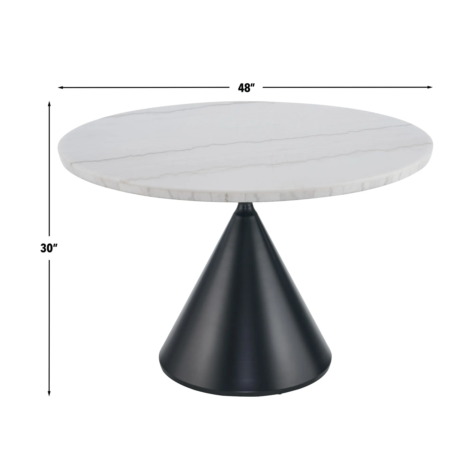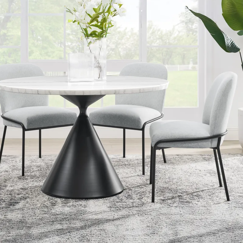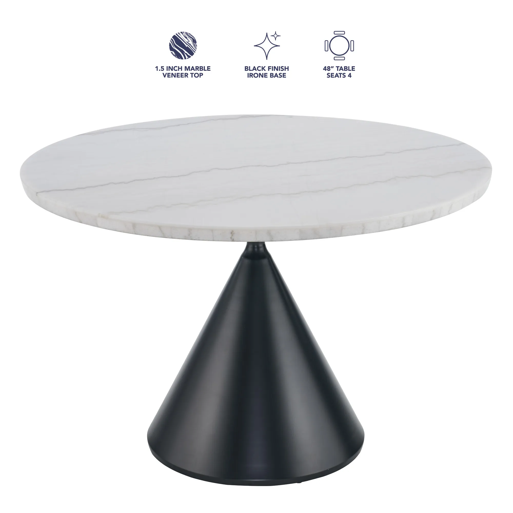 - 5-Piece Set includes the Conrad 48″ Round White Marble Top Dining Table and 4 Upholstered Side Chairs with Black Legs. Each item also sold separately.
