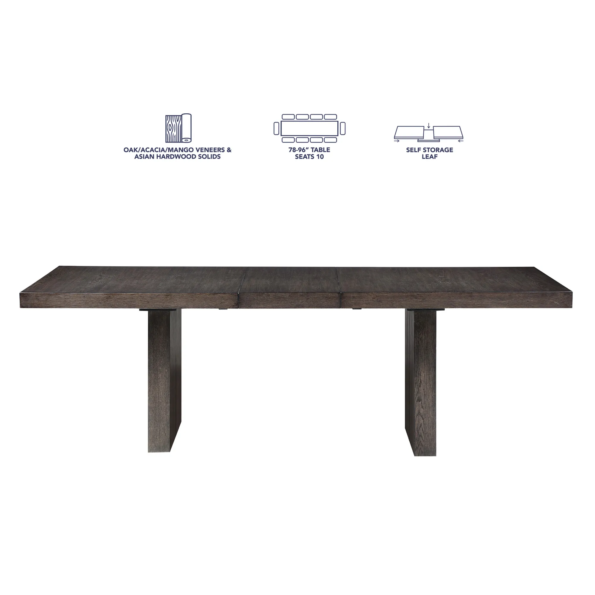 The Evan 78-96" Dining Table combines modern design with lasting durability. Built from oak and mango veneers over acacia and Asian hardwood, its kiln-dried wood resists warping and cracking. A sleek double pedestal base and clean lines offer a refined look, while an 18-inch leaf expands it to seat ten. The wire-glide mechanism ensures smooth extension, and a hand-stained walnut color finish enhances the natural grain. With easy assembly and included tools, this table is a stylish, functional centerpiece for any dining space.