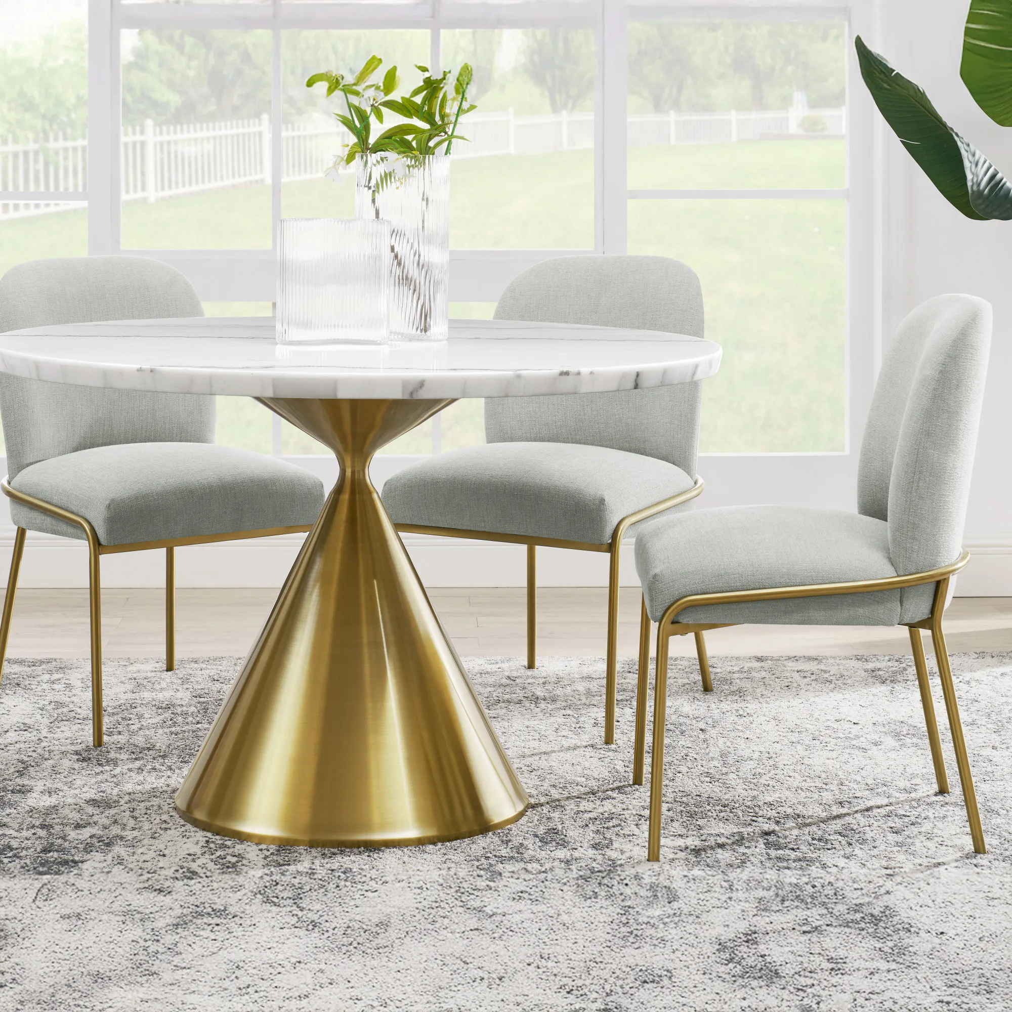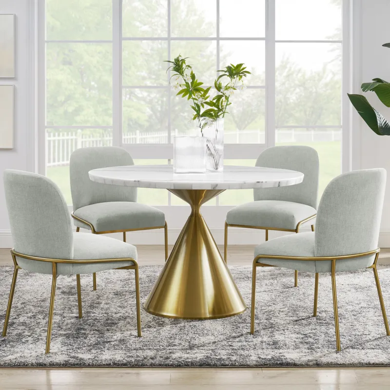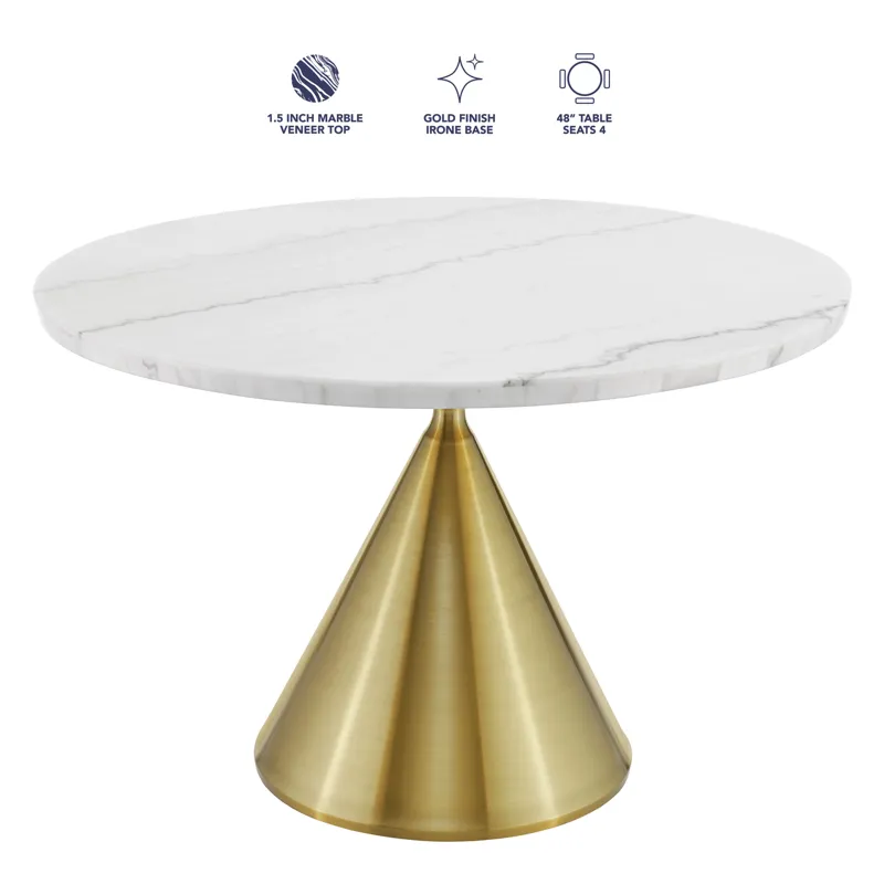 The Conrad 48″ Round White Marble Table with Gold Conical Base blends sleek sophistication with modern elegance, featuring a 1.5-inch marble veneer top with a refined knife edge and a striking gold conical base. This stylish table comfortably seats four, making it a perfect addition to any contemporary space.