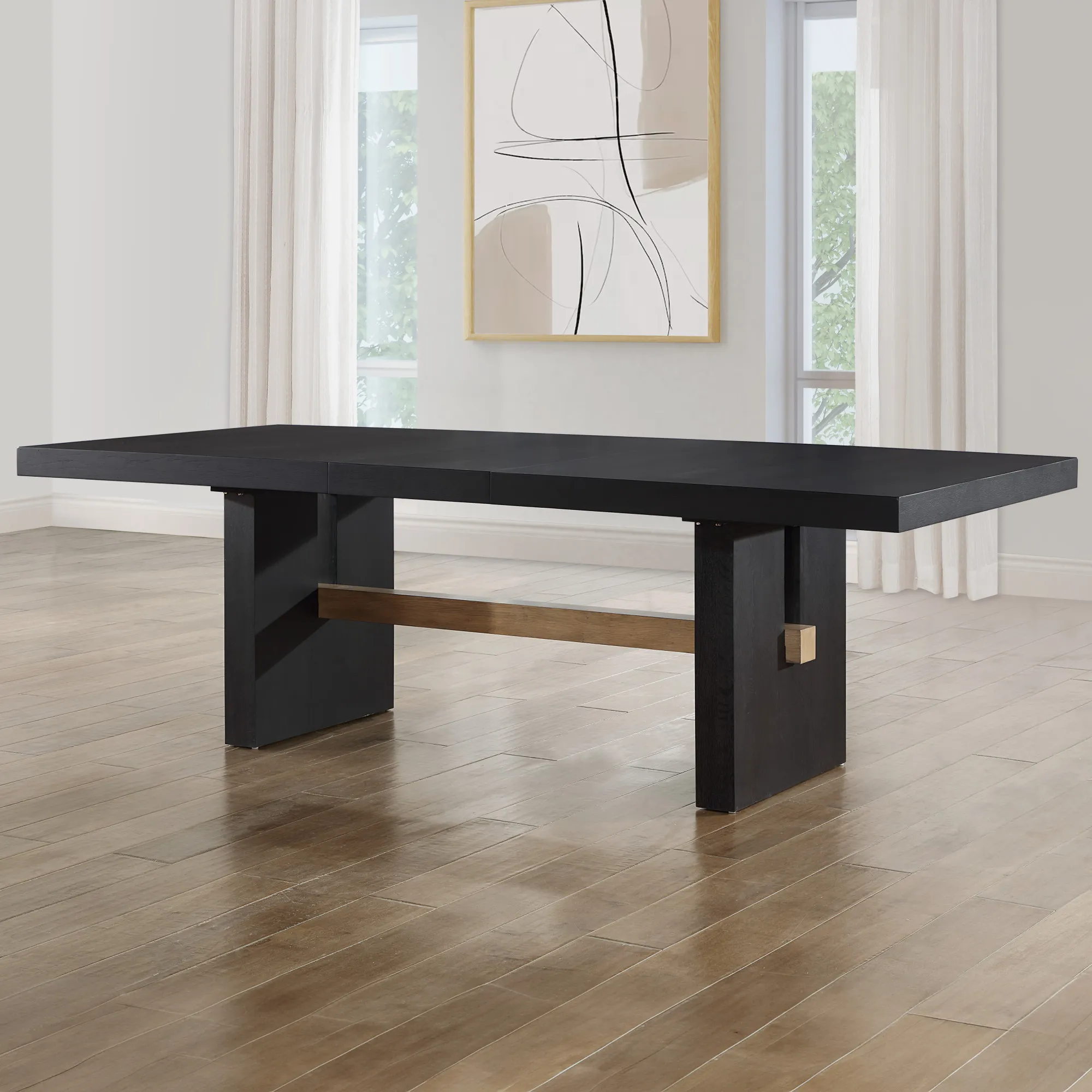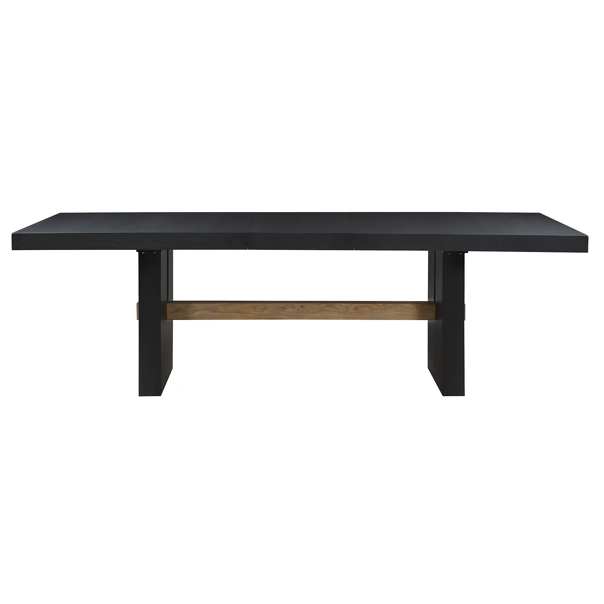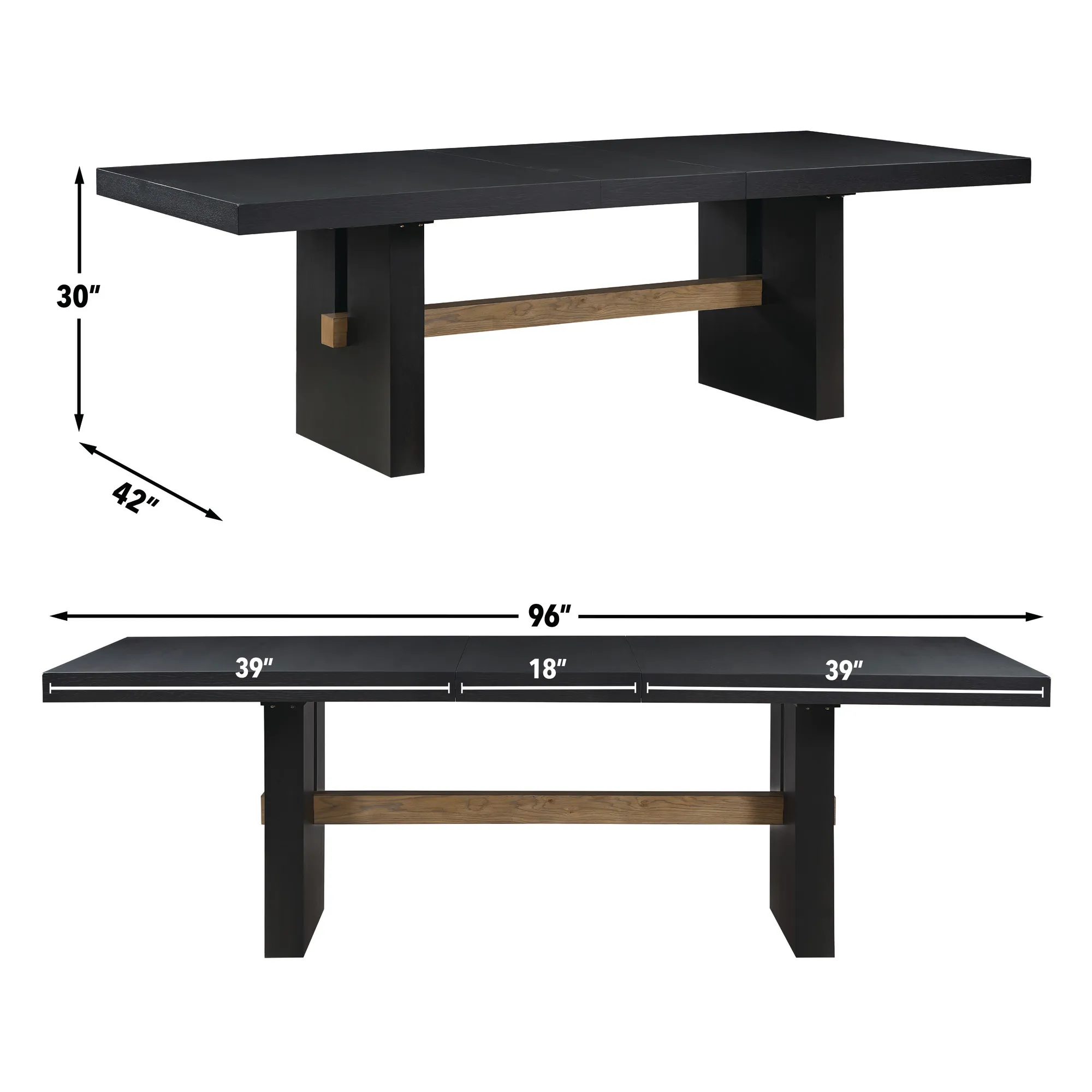 The Aubrey 78-96 inch dining table with an 18-inch leaf emanates modern lodge vibes, boasting clean lines and craftsman influences. Its sleek black finish exudes a contemporary allure, accentuated by driftwood-finished stretchers with exposed tenons, allowing for effortless mix-and-match styling with other driftwood pieces. Transition seamlessly from intimate gatherings to inclusive feasts with the simple insertion of the 18-inch leaf, expanding the table from 78 to 96 inches in a snap. Instantly accommodate up to ten people, ensuring ample space for memorable dining experiences with family and friends.