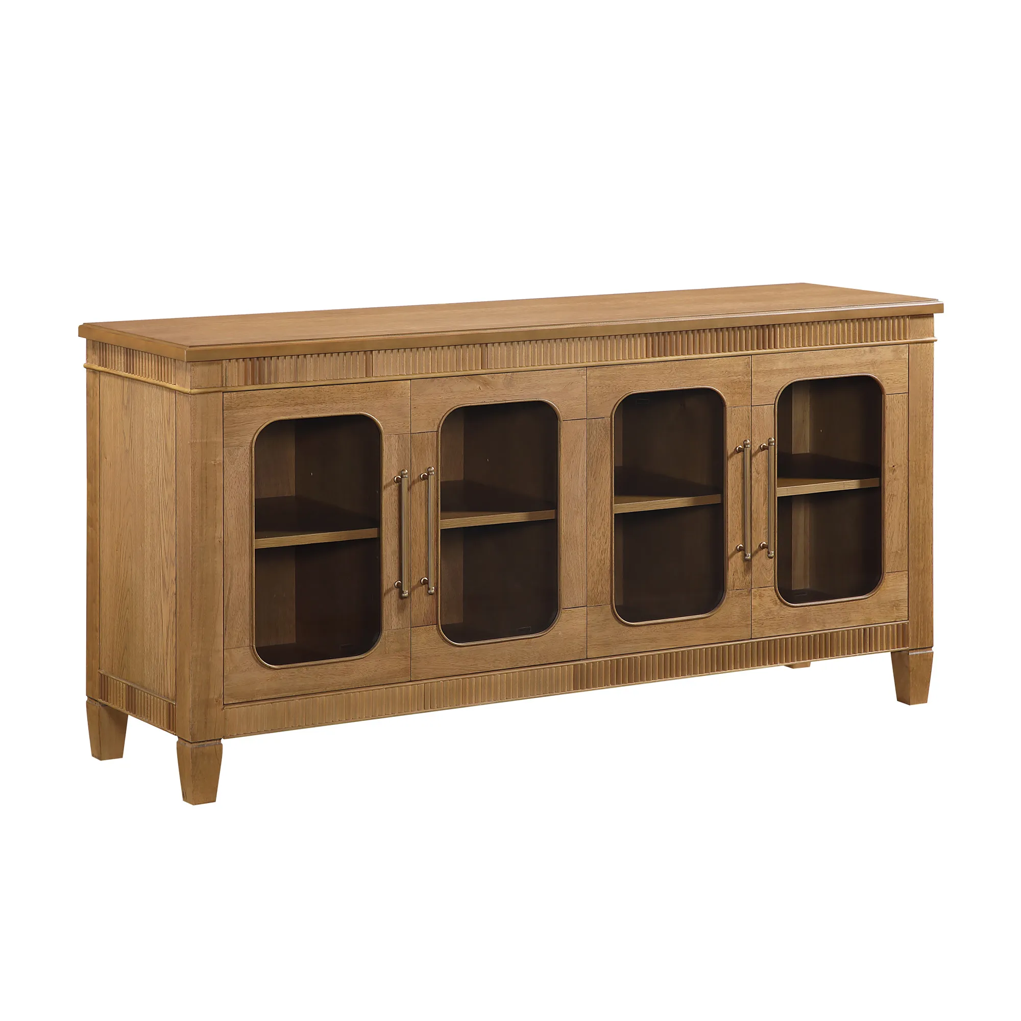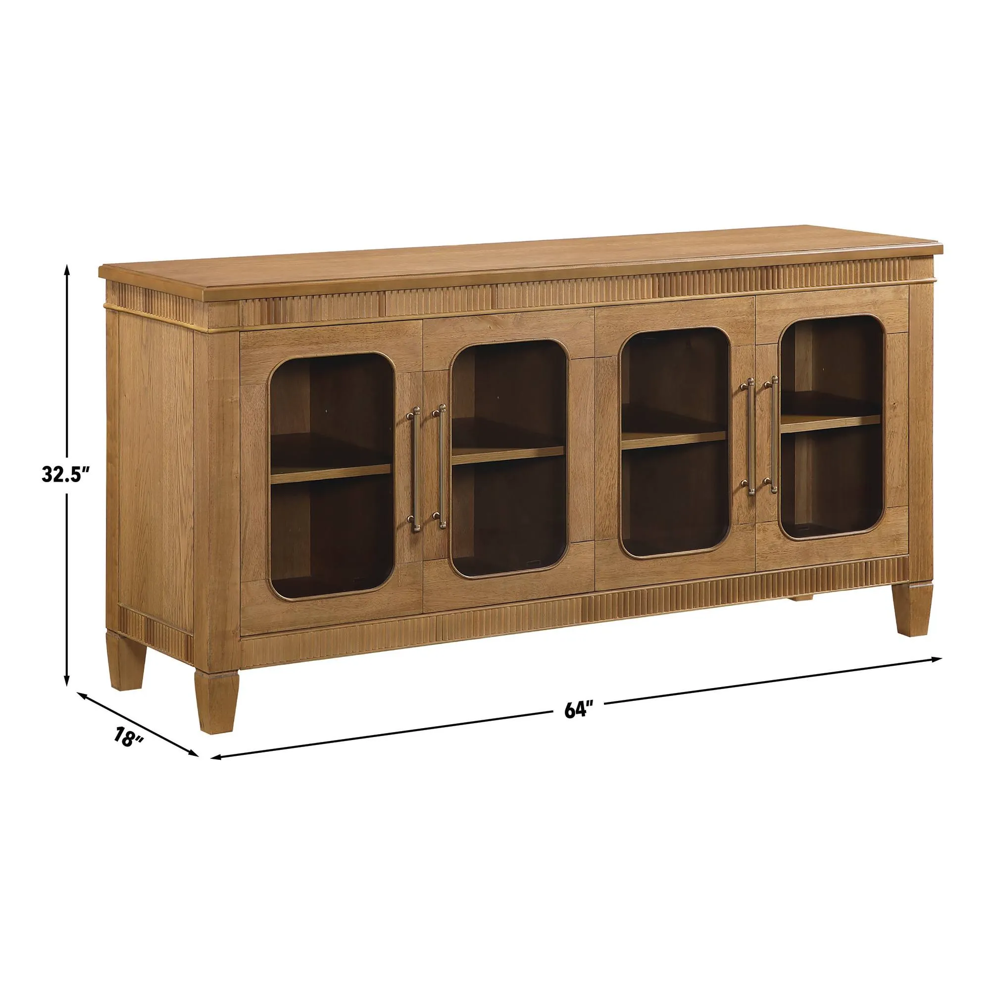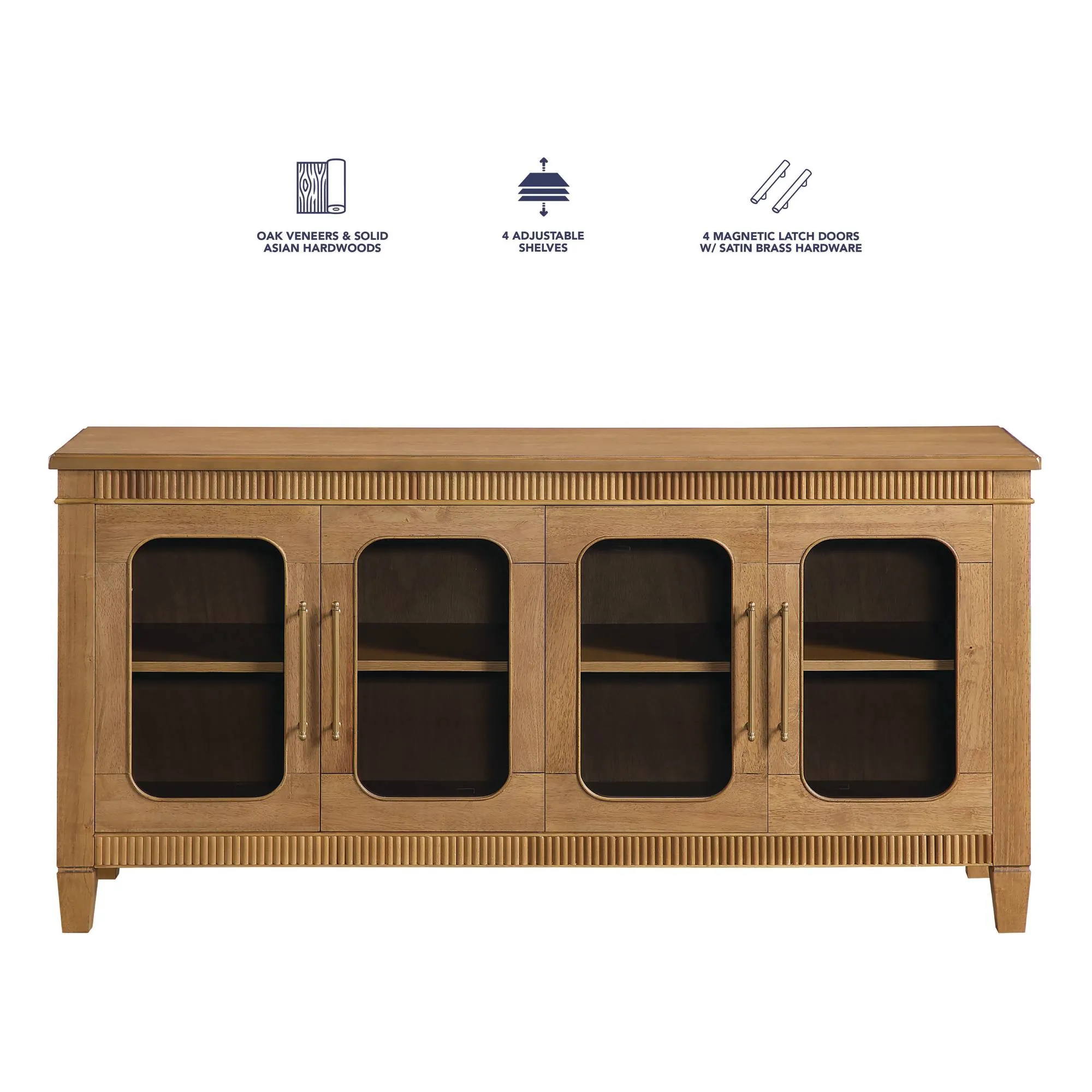 The Preston Butterscotch Server brings warmth, charm, and versatile functionality to any room. Its rich butterscotch finish highlights the classic dentil molding and rounded glass doors, creating a welcoming, stylish presence. Four adjustable shelves provide customizable storage within four spacious cubbies, while magnetic latch doors ensure secure, reliable closure. Perfect as a dining server, entertainment console, hallway accent, or sofa table, Preston offers beautiful display options, practical organization, and a timeless design that enhances both traditional and contemporary interiors with effortless appeal.