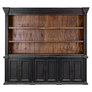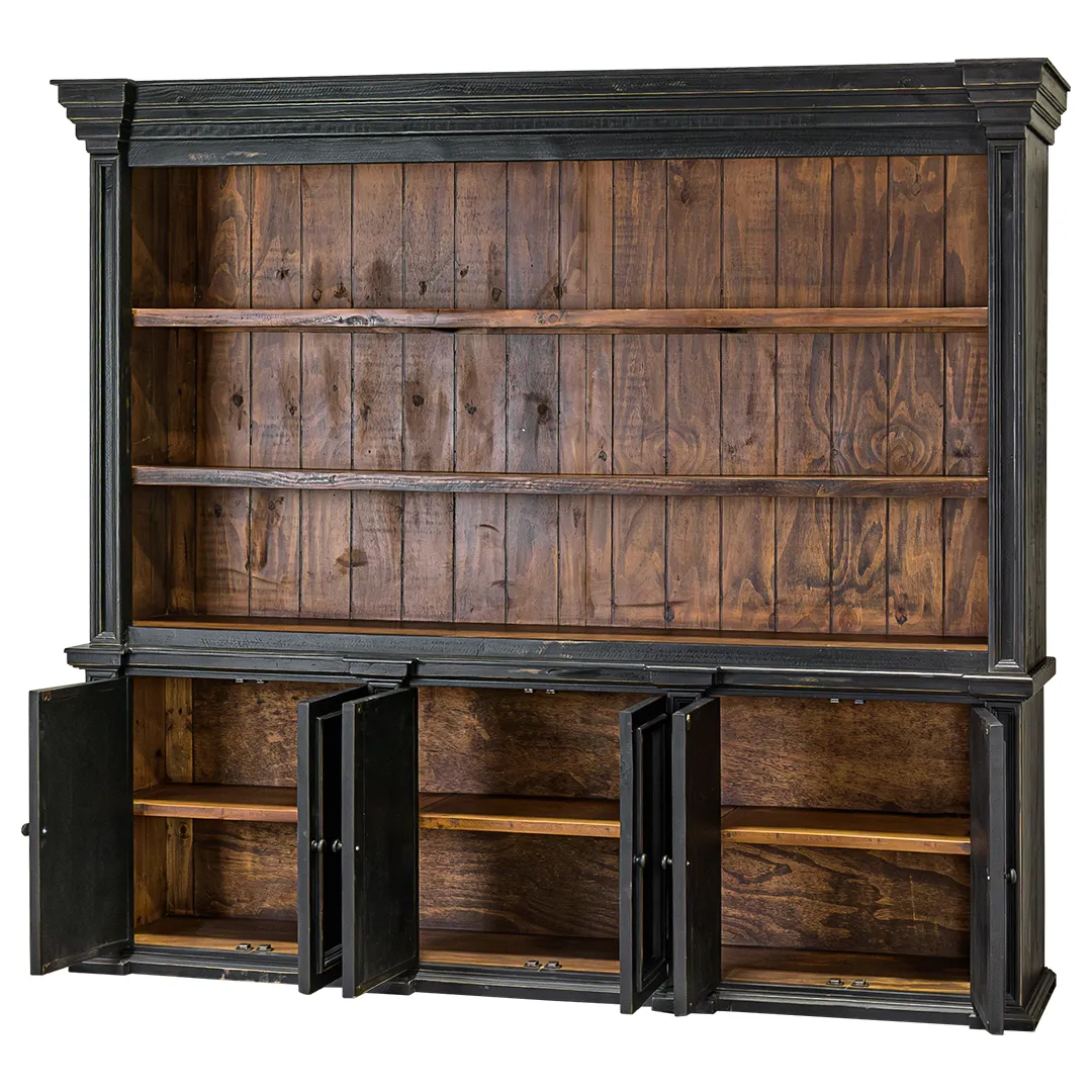 The Toulouse library cabinet consists of a large hutch with 3 shelves and base with 6 doors. Finished in Sanded Black with a Caramel interior, it offers a bold, traditional storage and display solution.