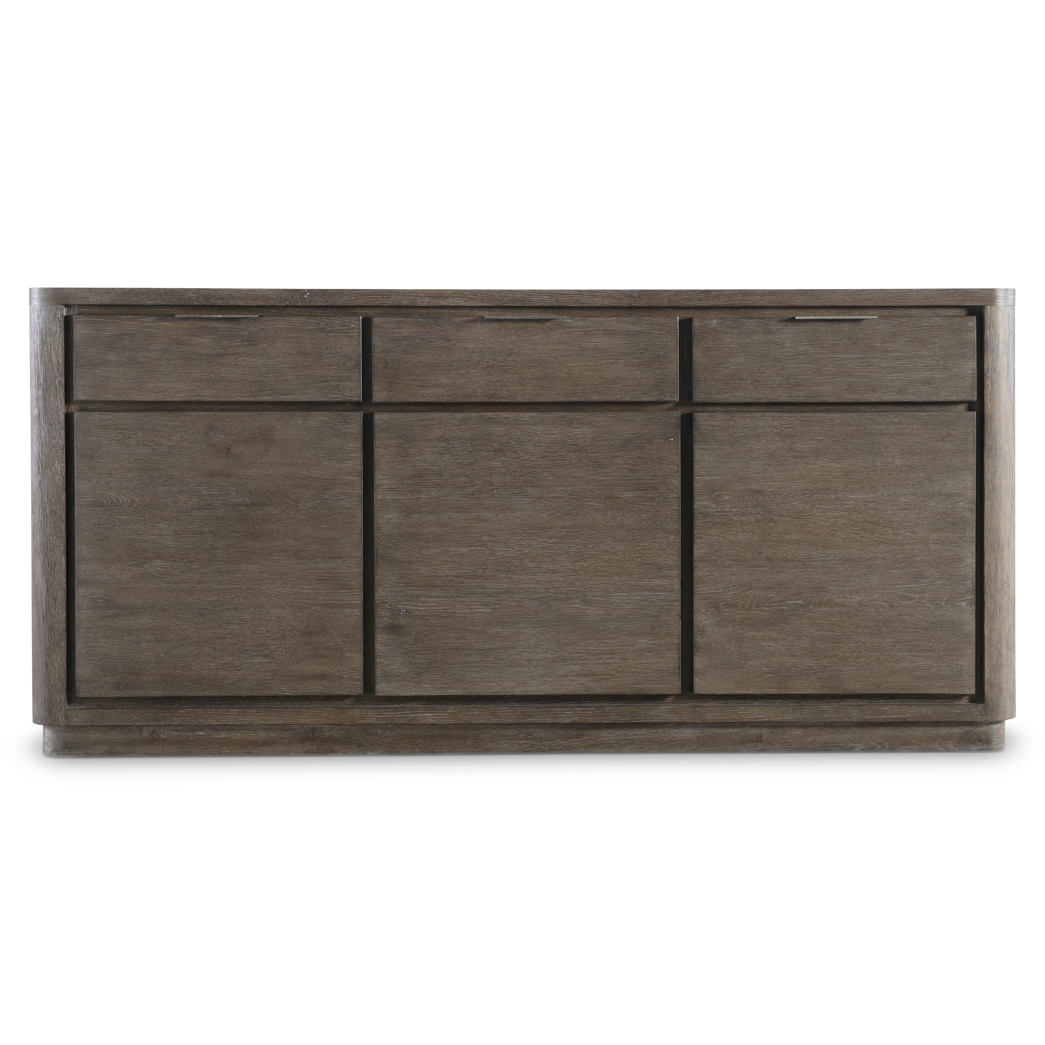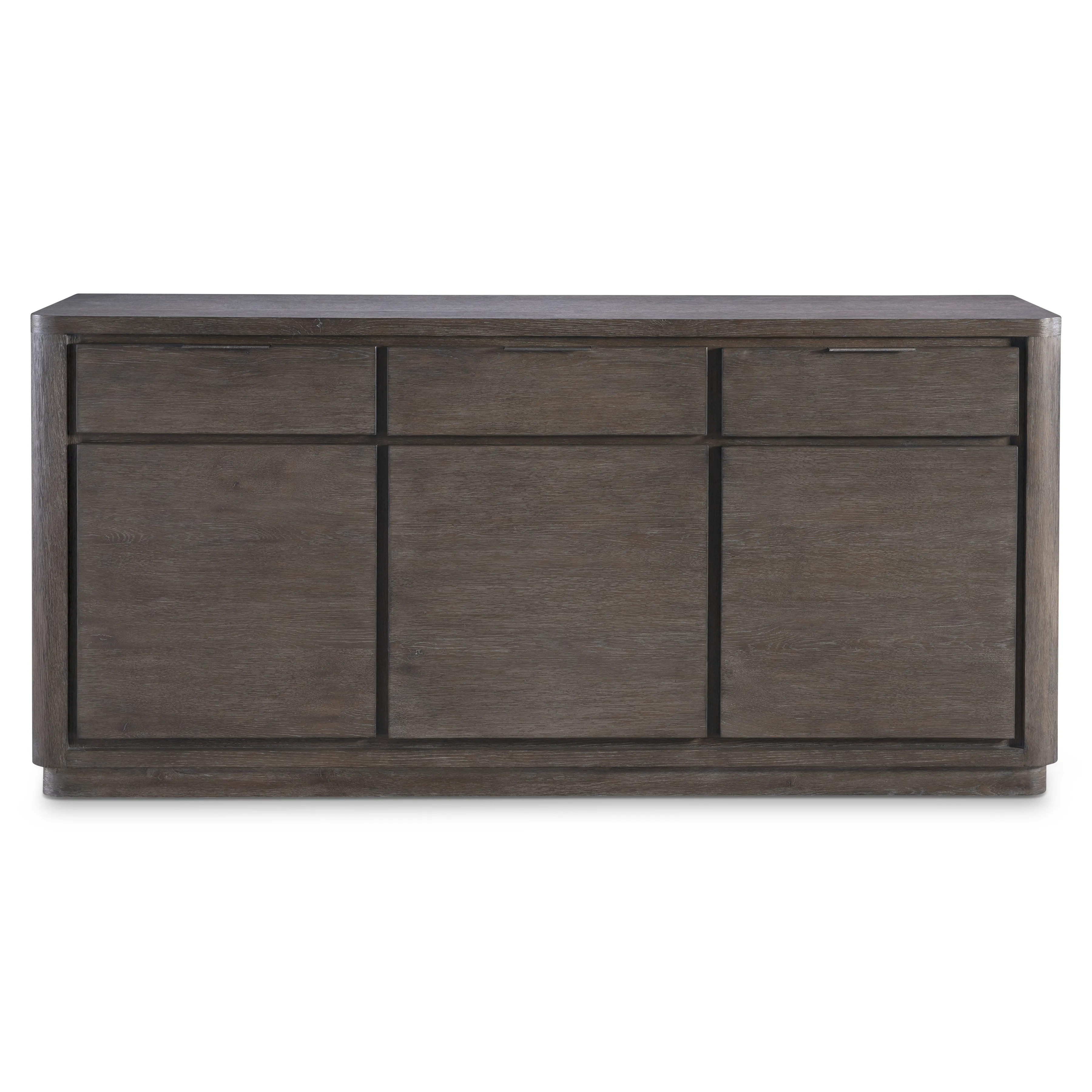 The Outline buffet defines a new look for modern minimalism. Three drawers and three doors in Cassel finish have a dimensional look against a recessed backdrop, highlighted with textured metal pulls. Corners are rounded, and lines are streamlined for a seamless sophisticated look.