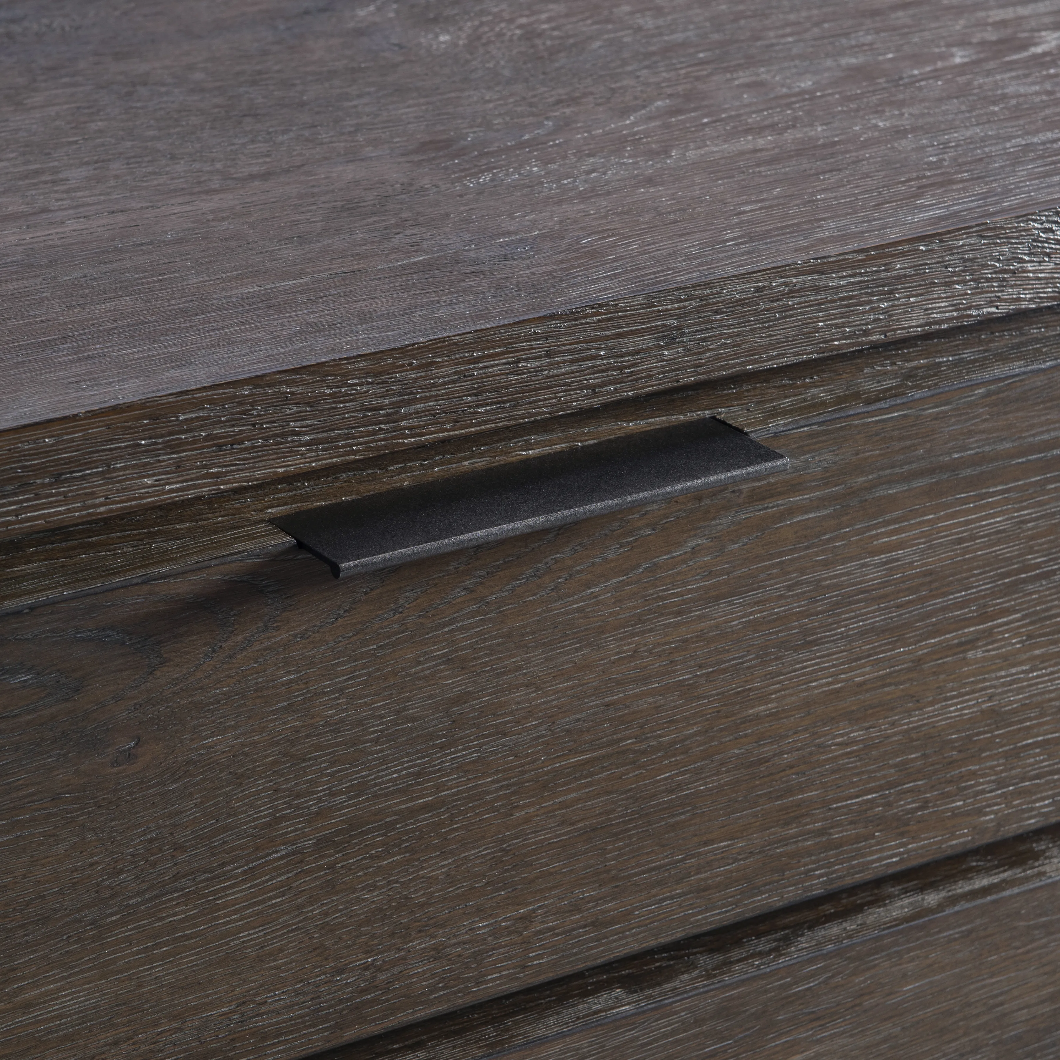 Wirebrushed Oak Buffet in Cassel finish. Three pull-to-open, soft-close drawers with Applied Texture Aluminum Tab pulls in Atra finish. Brown Guardian Cloth Wrapped Pad in two drawers and a brown Guardian cloth silverware insert in center drawer. Three pull-to-open doors. Six adjustable shelves. Grommets and vents. Plinth base. Adjustable glides. Anti-tip kit. Suitable for use with TV