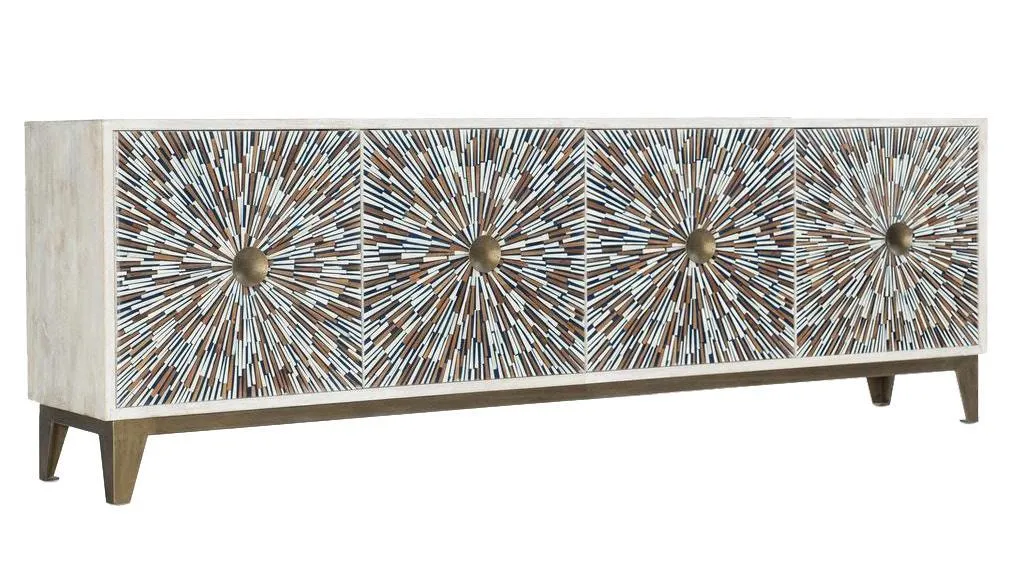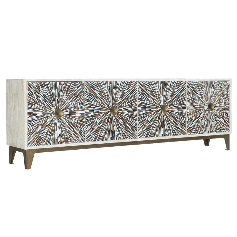 The Fitzroy cabinets are constructed, using tongue and groove joint methods, of mango timber in a water resistant lacquer sealed white wash finish-with MDF used as necessary for stability of the decorative work. Features of this "sideboard" include door fronts with a distinctive pattern of hand set bone inlay, large round antique brass finished door pulls-a matching metal base, and shelved interior compartments.