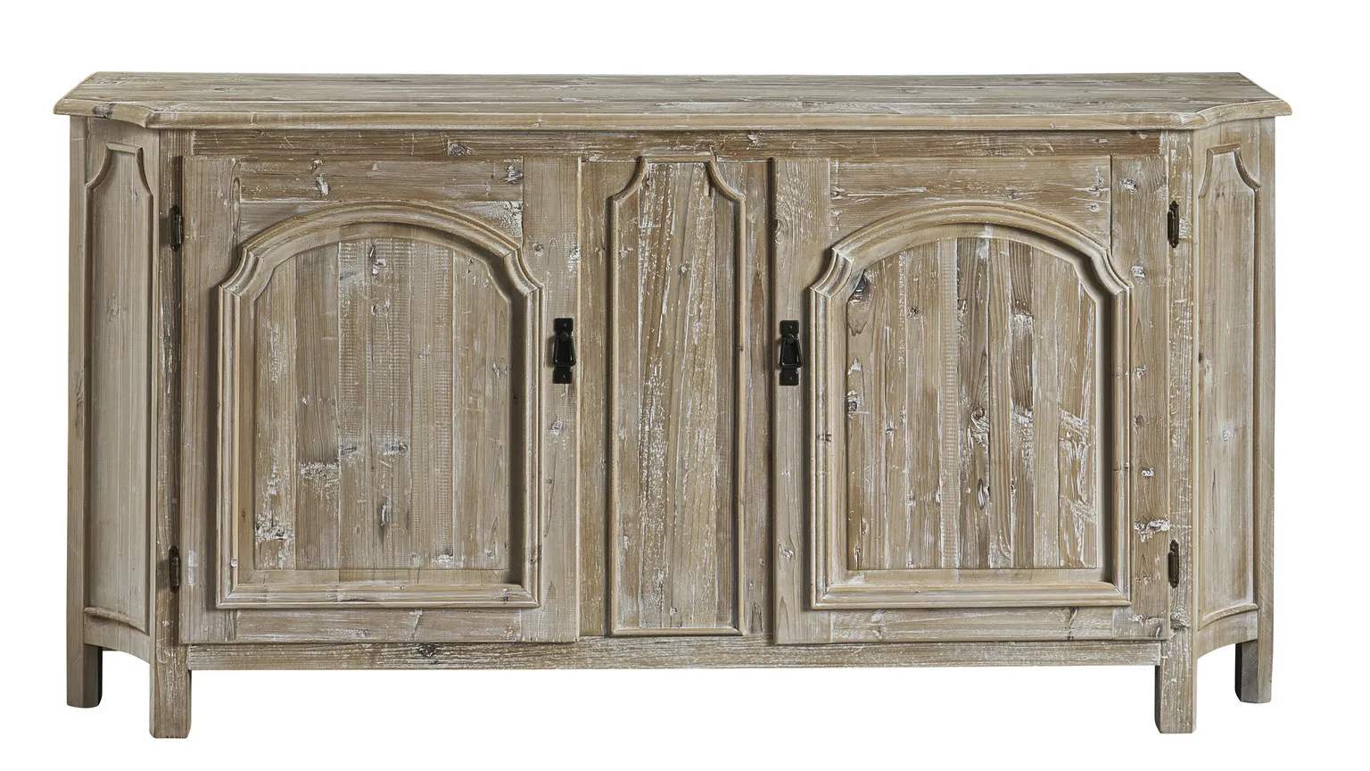 Quietly elegant with concave curved ends and gently arched applied panels on each door, this reclaimed pine sideboard offers substantial storage with a shelf behind each door. Perfect beneath a piece of art, it also welcomes a big screen TV making this cabinet a great fit in many rooms.