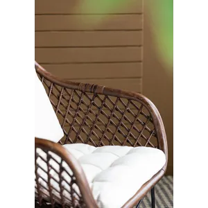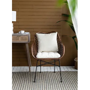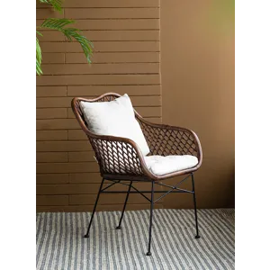 This palapa chair is a transitional piece featuring mixed materials: black iron legs,a contrasting white cushion,and a natural rattan frame.It’s a comfortable seating option for your dining room or kitchen.With its neutral colors and casual style,this rattan chair can create a cozy atmosphere in a living room.