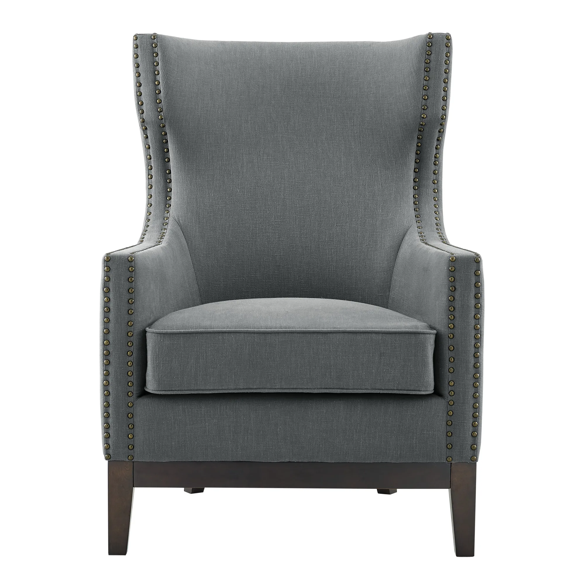 • Styling details include wing-back design with modern touches like scalloped sides and rounded back, tapered solid legs and loose seat construction with brass nailhead trim