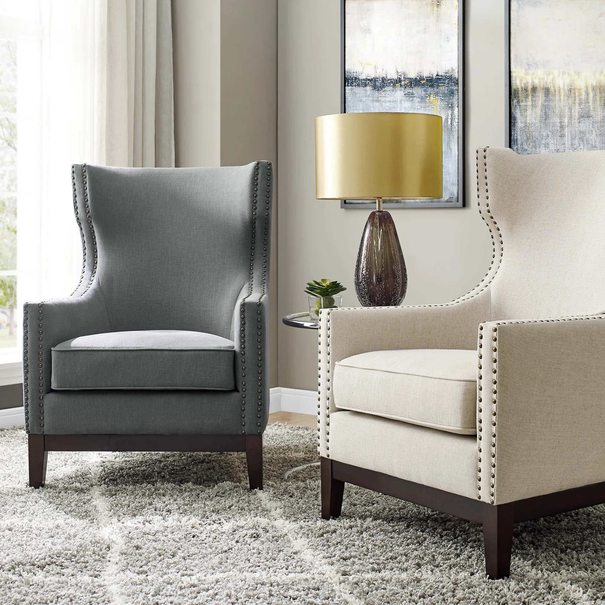 Roswell updates the classic wing-back chair with a more contemporary profile you are sure to love. This is not your father's wing-back chair but today's parlor chair with a linen look and brass nailhead trim. The softly rounded back adds design and comfort while making an interesting presentation even if the chair is floating in the room. Scalloped sides add flair and style to a dazzling chair.