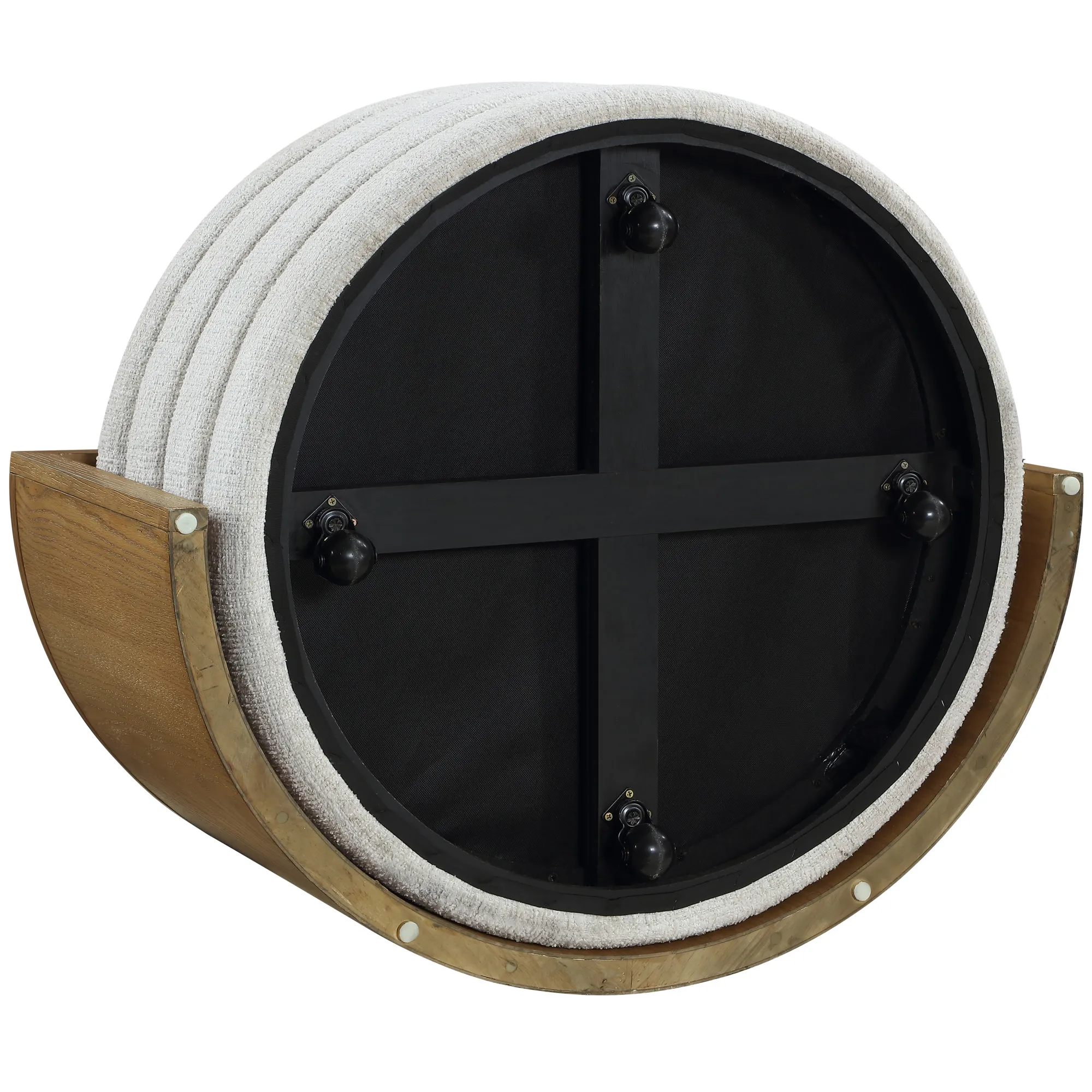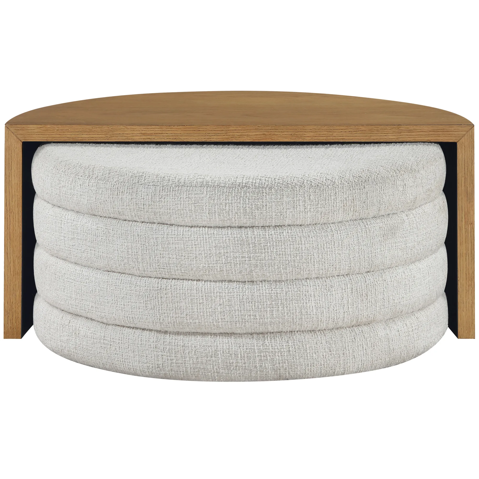 - The ottoman, upholstered in 100% polyester cross-hatch boucle fabric in an eggshell hue, offers a durable, easy-to-clean surface that resists everyday stains and spills.
