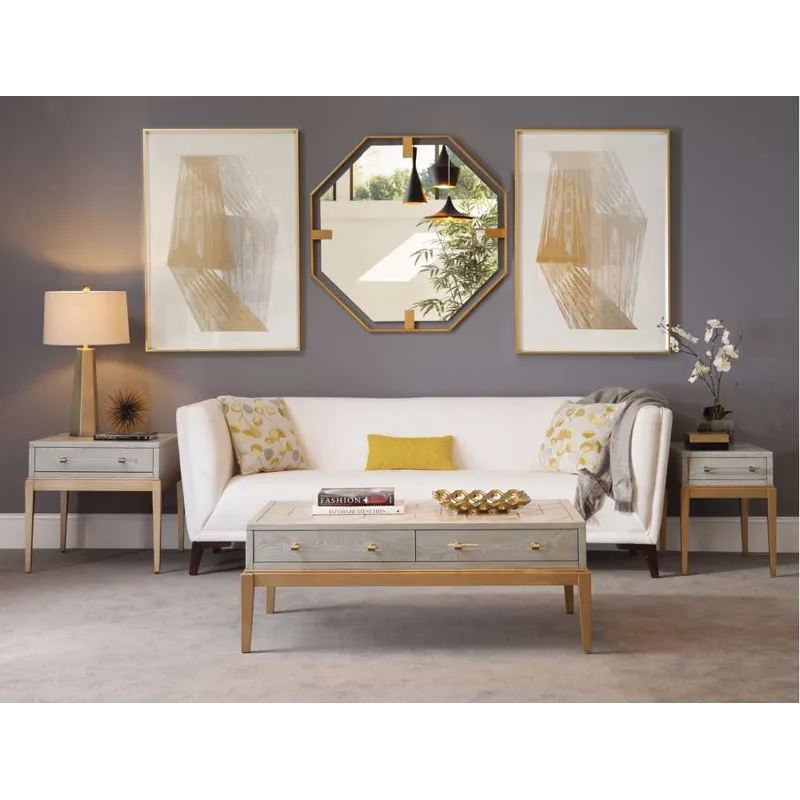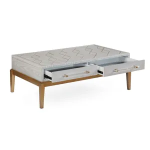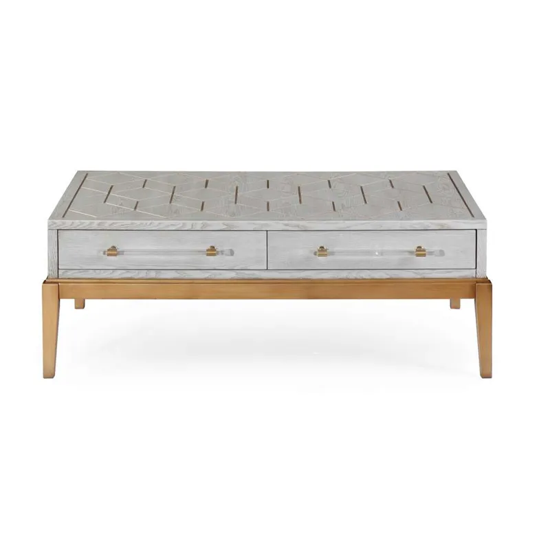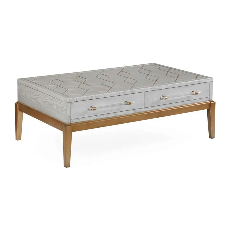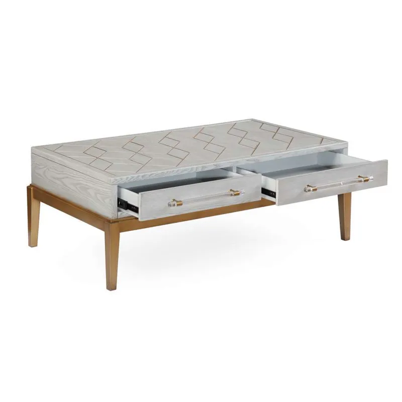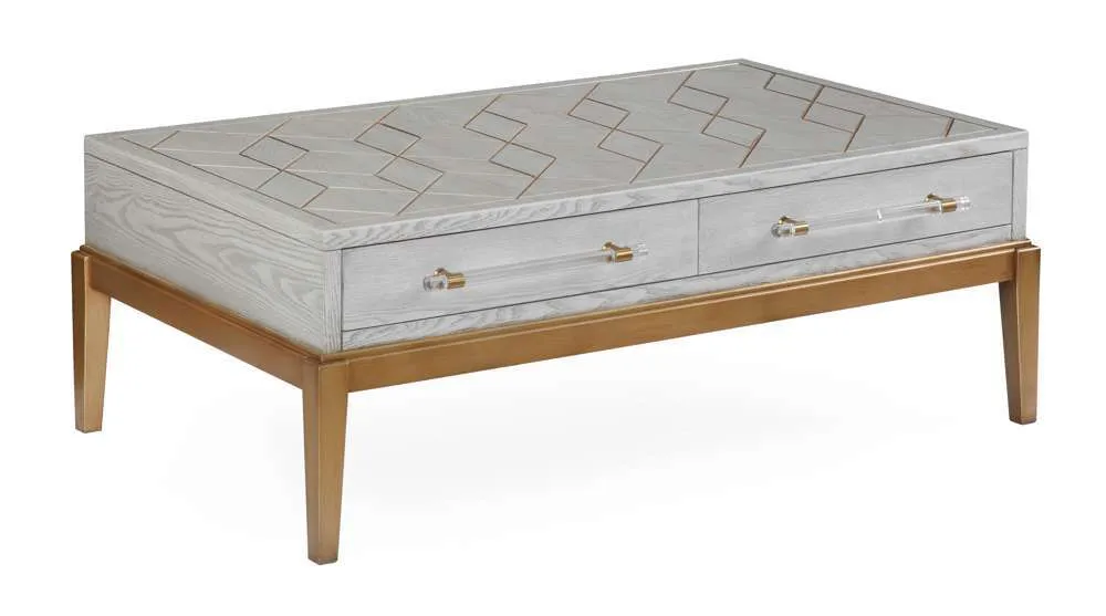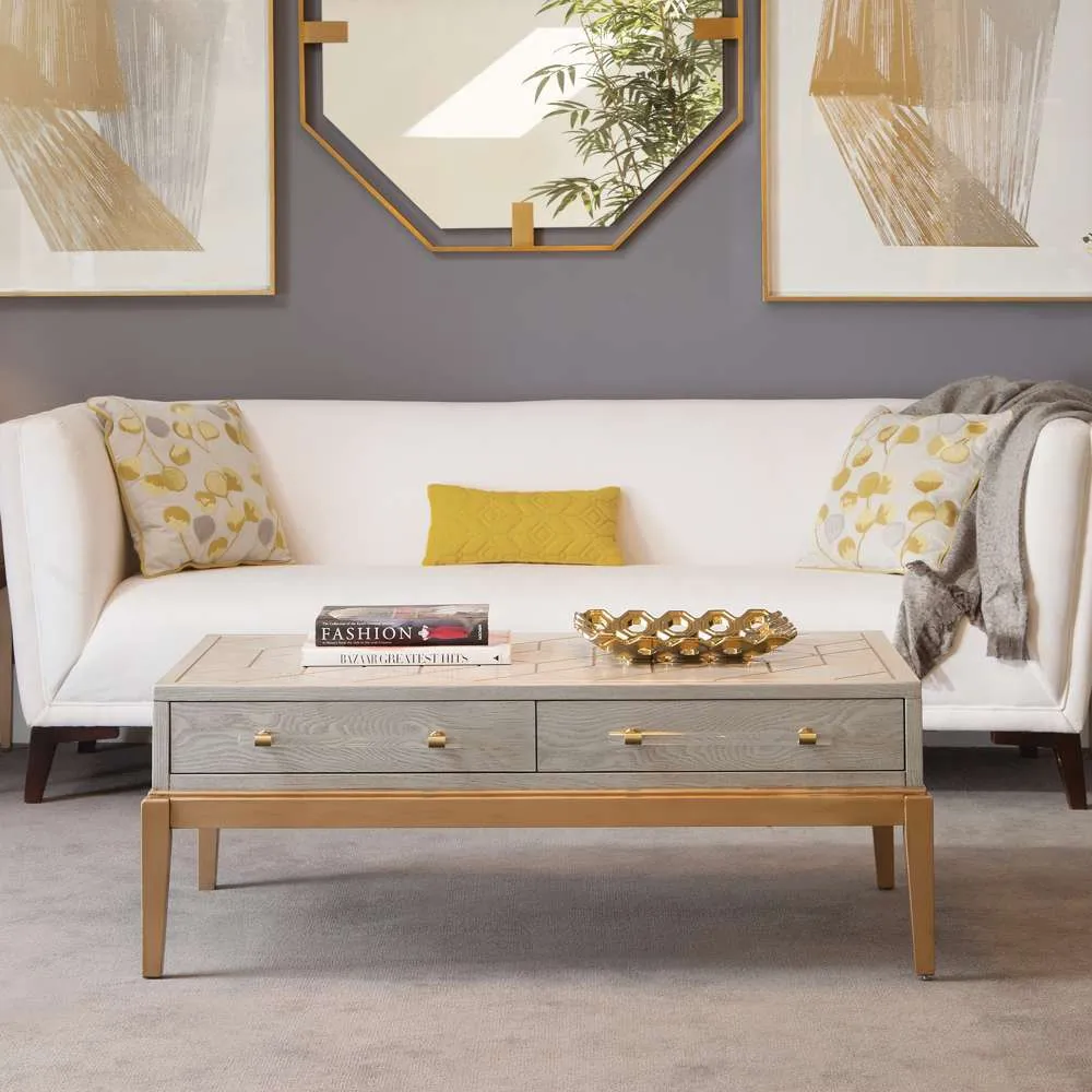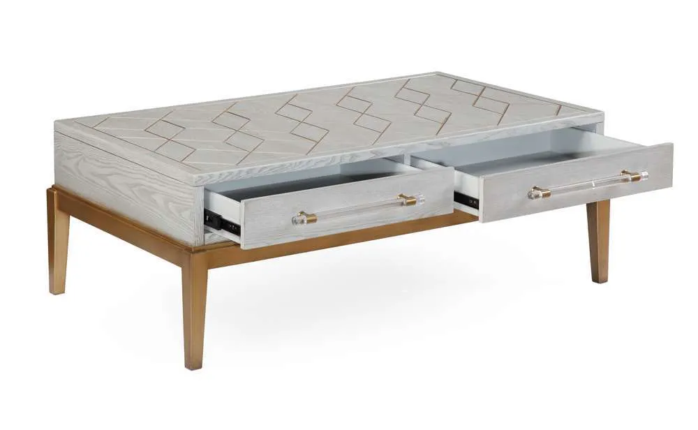 The Perrine Rectangular Cocktail Table will make the perfect centerpiece for your living room. The gold legs pop against the soft graphite gray table top. The top is accented with antique gold geometric inlay design, and custom acrylic hardware for the two draw pulls