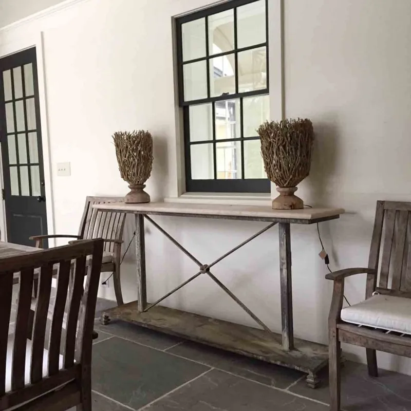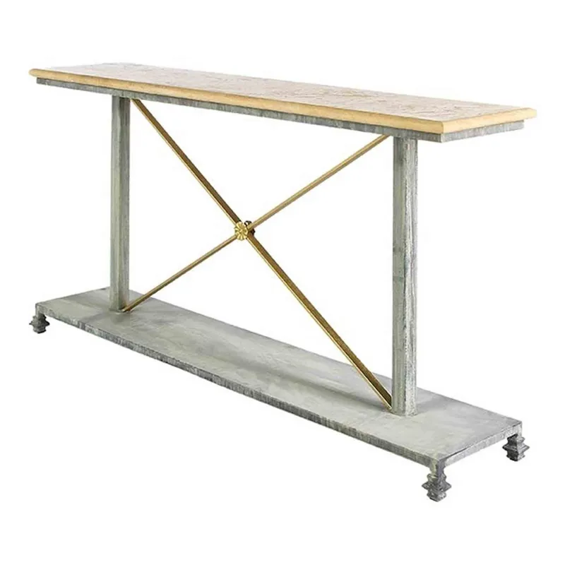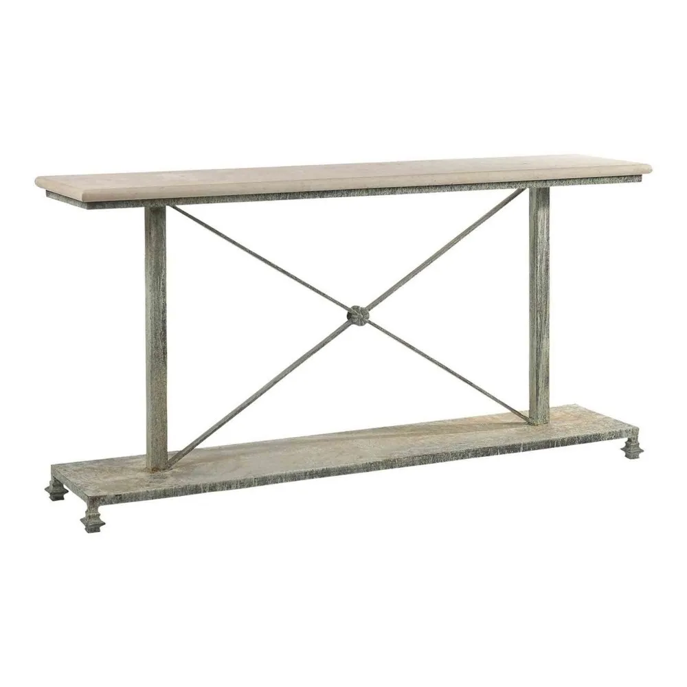 Simplistic yet refined, this wrought iron and stone console table is ready to make a display in your space. The X-style frame provides an unexpected twist in appearance, making it easy to improve the look of your home.
