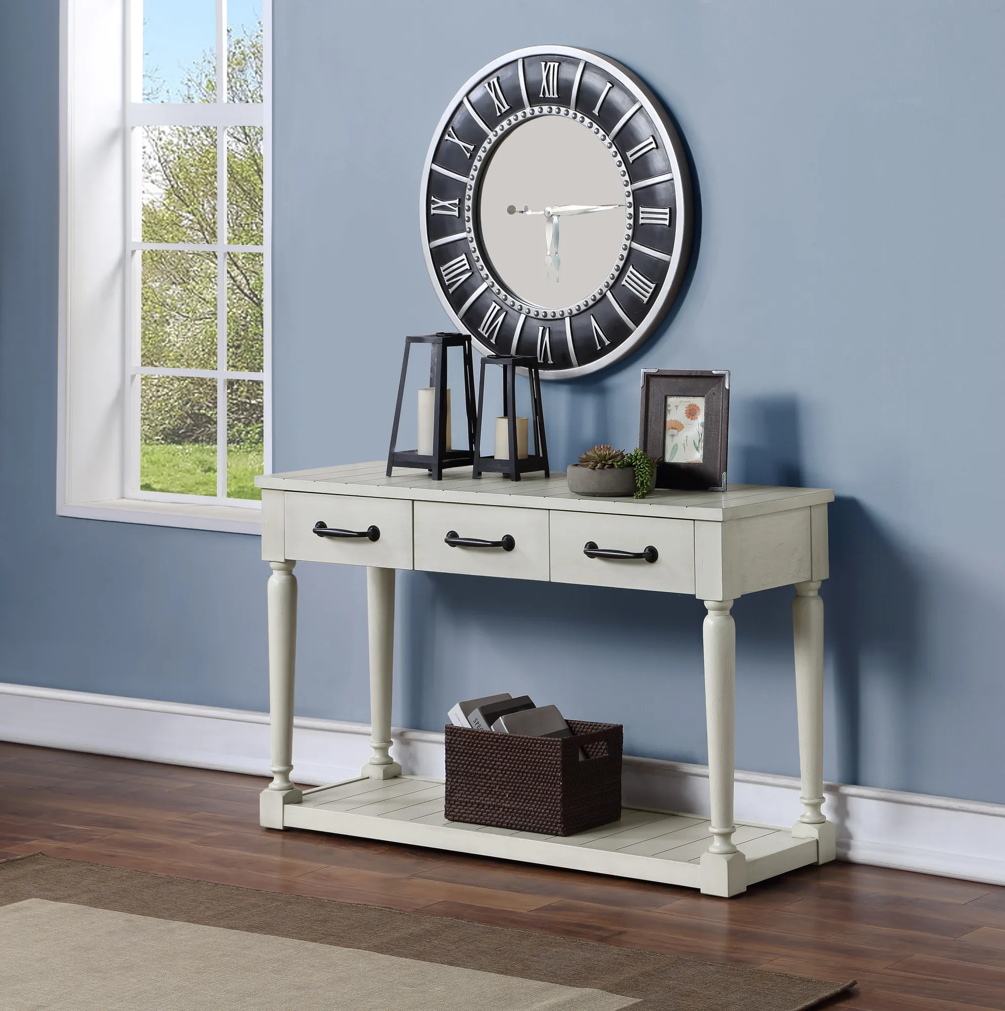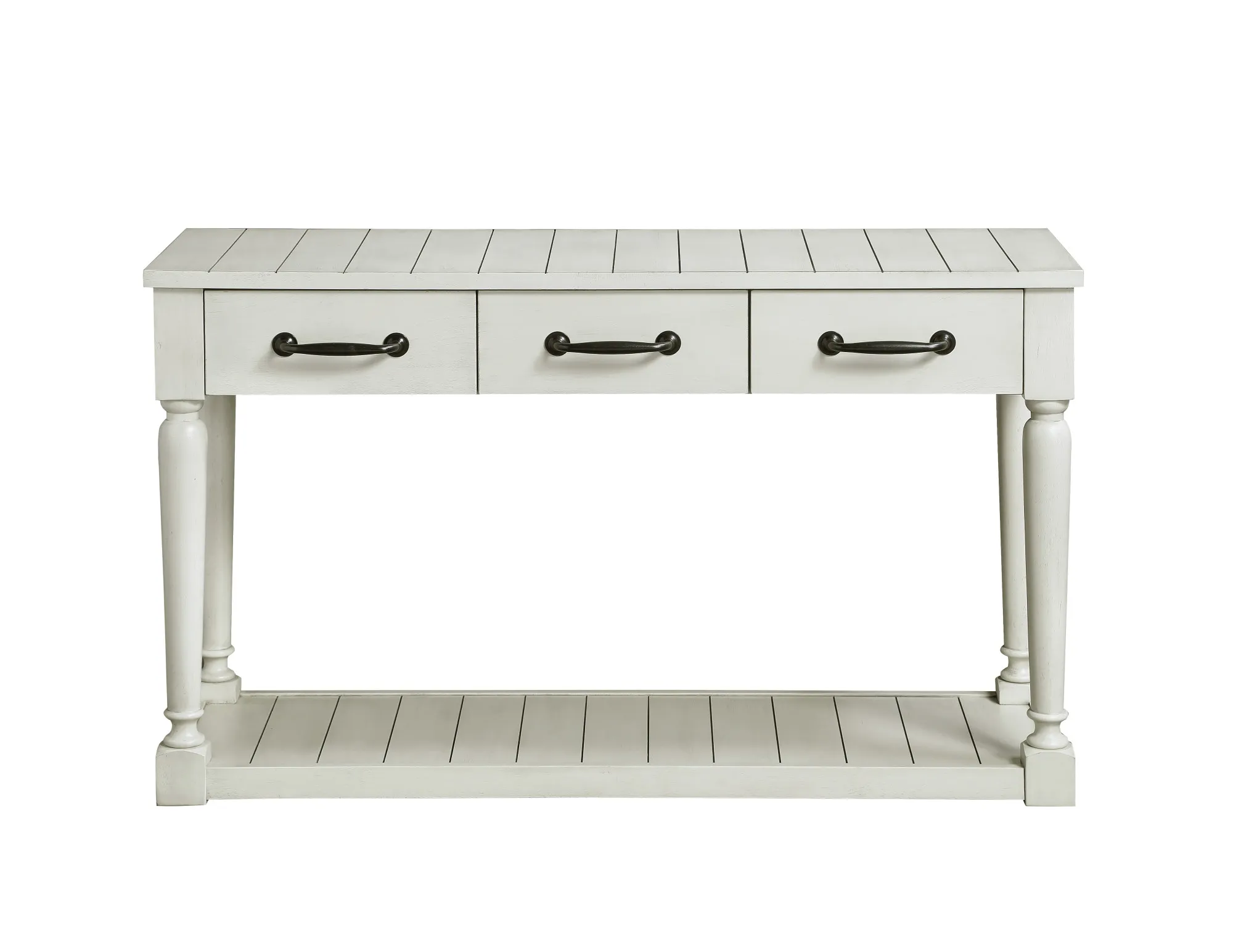 Cottage styling in a Sofa Table that fits in any casual environment. The Hemingway Sofa Table features plank top and plank base with turned legs and alabaster finish for hust the right farmhouse feel for today's casual environments. The ebony metal hardware offers just the right neutral contrast to pair well with casual upholstery settings. The working drawers offer a place for convenient storage. Pair the Sofa Table with the other tables in the Hemingway collection or use alone as a Hallway Console, at the back of a Sofa or as an Entertainment Unit.