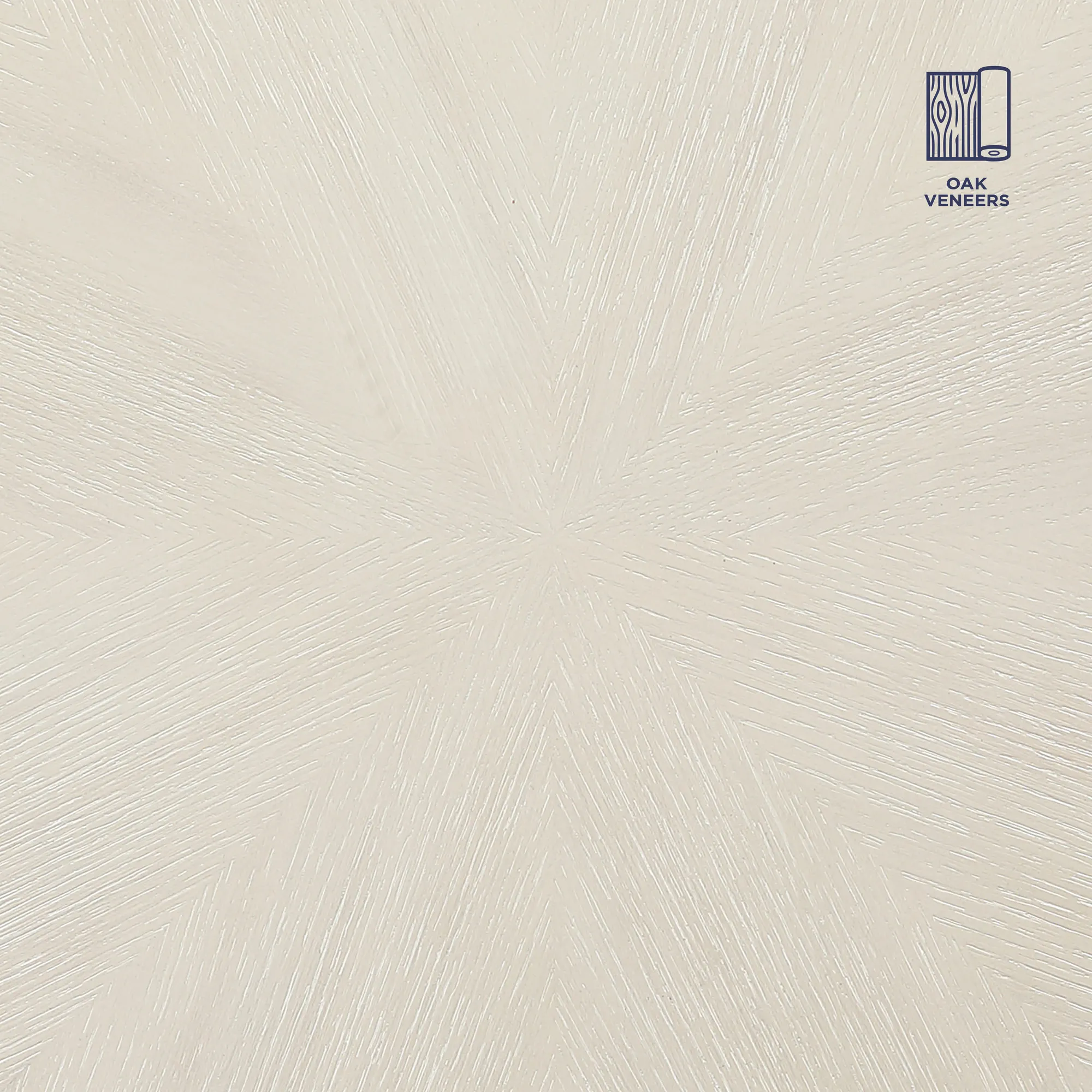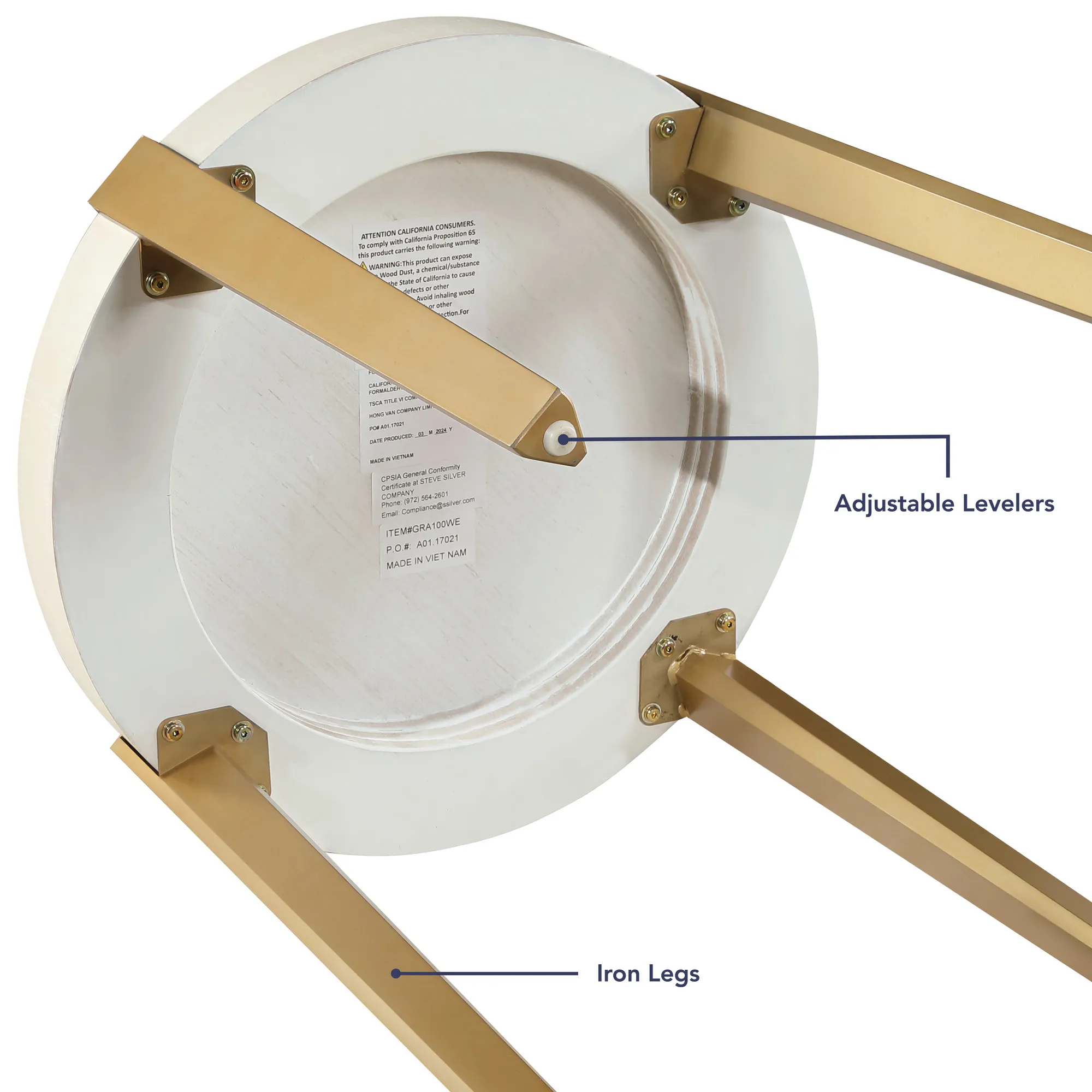 The Gracie White End Table is a stunning blend of modern industrial charm and elegant design. With a round, flowing silhouette and washed white finish, it showcases oak veneers in a mesmerizing sunburst layup. The satin gold finished metal legs, geometrically shaped and exposed on top, add a bold, contemporary look. Ideal as a side table beside a chair or between upholstered pieces, it brings style and functionality to any room. Light and airy, this distinctive piece brightens up any space with its impressive design.