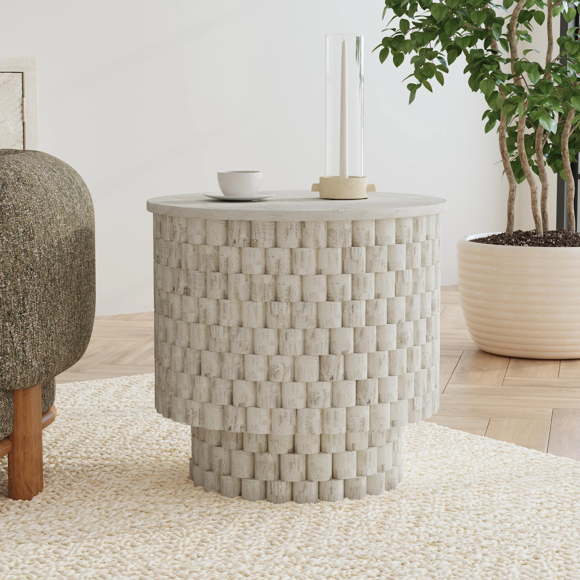 The Mango Round End Table is crafted from mango wood featuring soft curved edges that create a warm, inviting look. Its organic modern design blends natural materials with a contemporary touch, making it a perfect addition to any space.