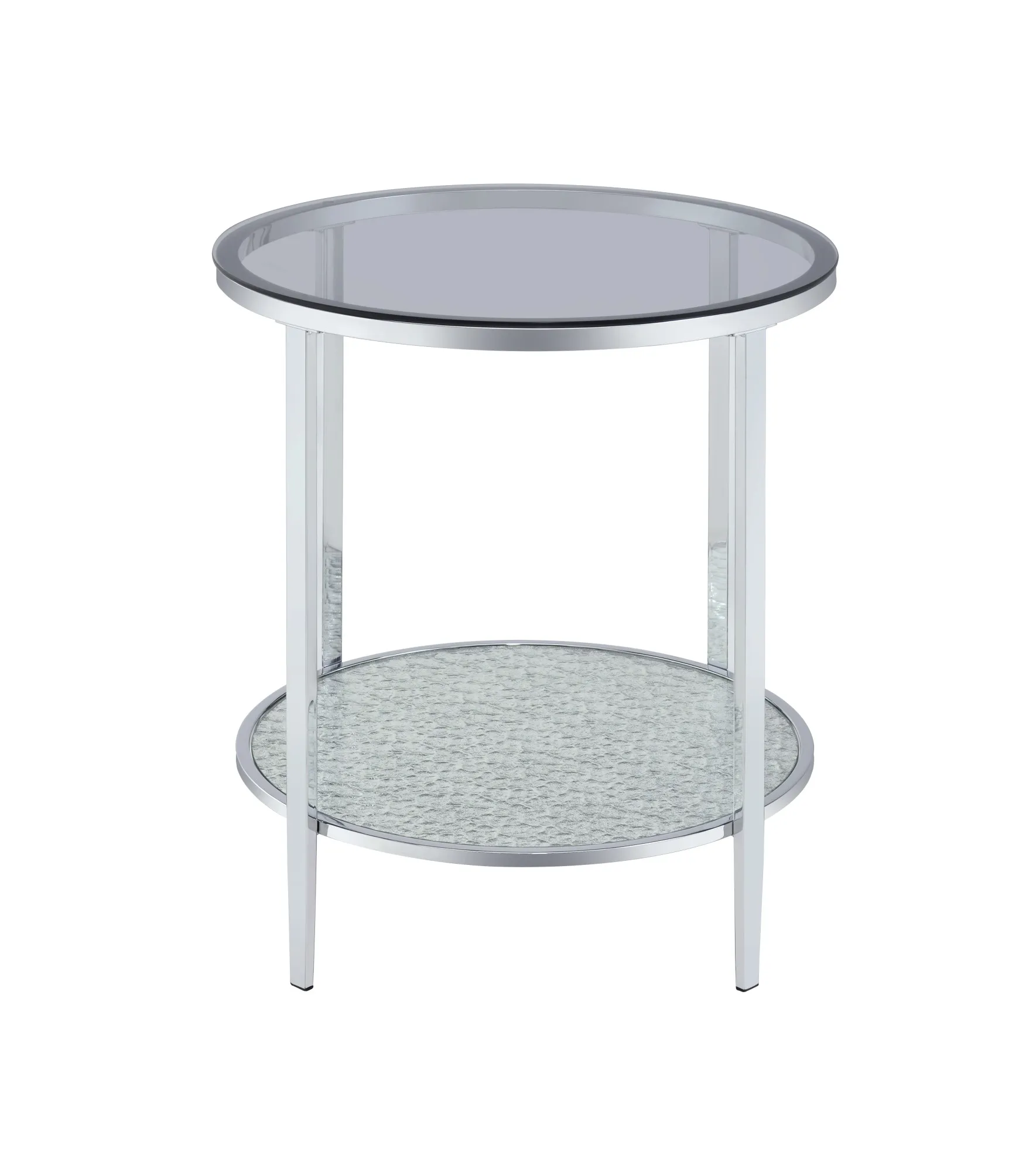 Smoky glass top, a patterned mirror shelf and a chrome base combine to add sparkle and glam to a room in this romantic round End Table. Frostine features a round shape that softens a room and makes it easier to navigate by eliminating pesky corners. Use with beside your favorite chair, sofa or as a Nightstand in the bedroom and add a little glam to your life.