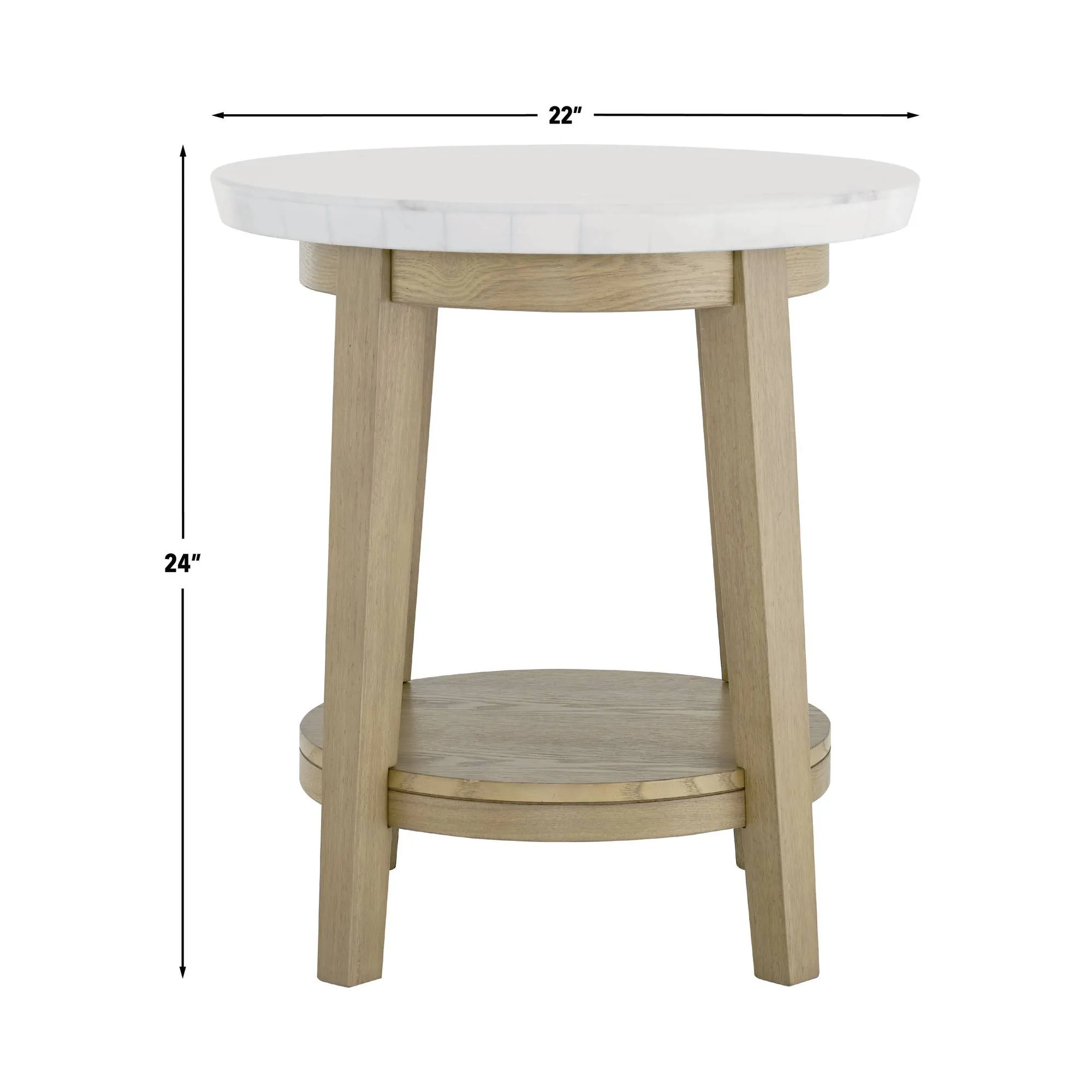 The Vida 22″ Round White Marble Top End Table blends Scandinavian and Mid-Century Modern design in a compact, versatile form. Perfect as a side table or placed between upholstery pieces, its light burnished blonde finish and handy bottom shelf offer both beauty and functionality, providing space for storage or display. The elegant round shape creates a soft, flowing aesthetic, making it a stylish and practical addition to any room.