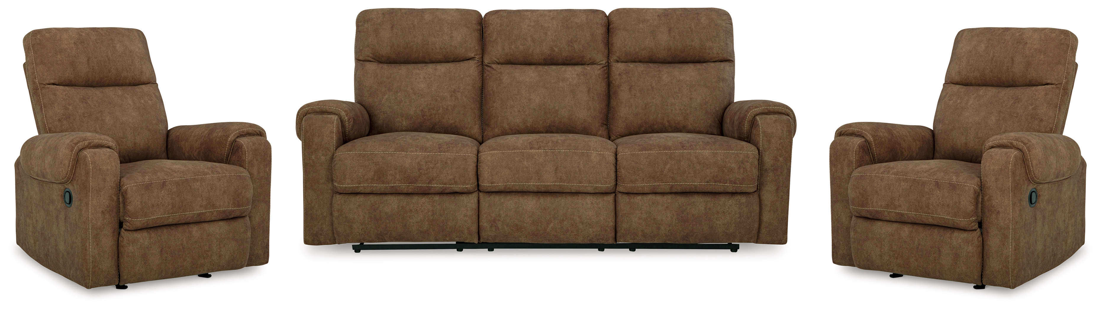 This seating package is your best shot for comfort and total relaxation. Its super soft faux leather, contemporary bustle back and contrast stitching team up for a big win with most any color scheme and room decor. With the pull tab reclining motion, you're on your way to endless relaxation at home solo or when hosting friends.