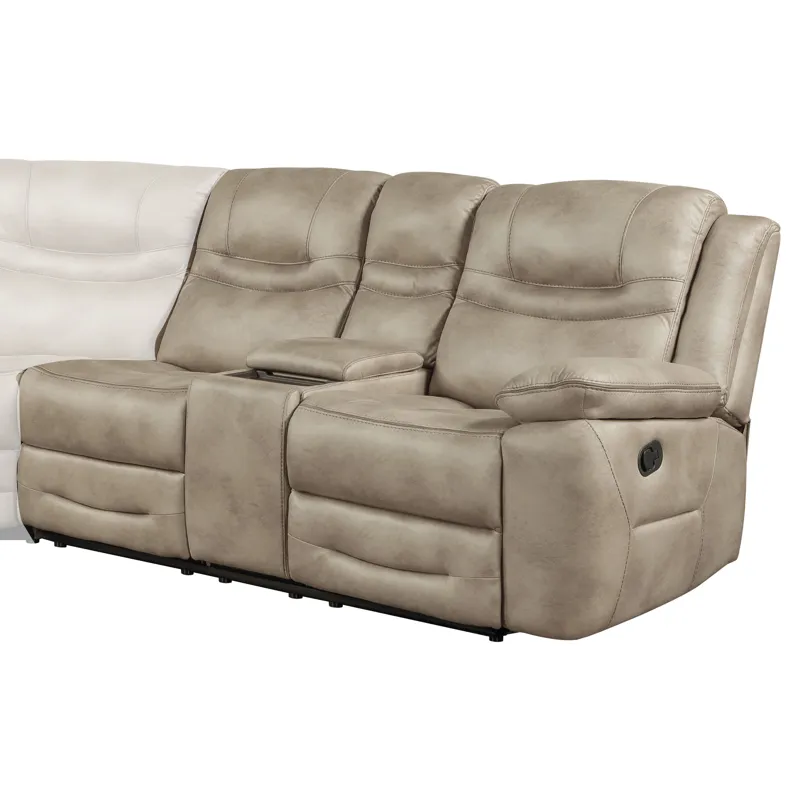 The Shelton Right-Arm-Facing Loveseat delivers plush comfort with added functionality. Upholstered in soft camel polyester, it features a reclining outer seat that extends to a 135-degree angle with just 3 inches of wall clearance. The center lift-top console includes a wireless charging surface, hidden storage for remotes and essentials, and two stainless steel pop-out cupholders that remain hidden until needed. Generously padded top arms and headrests enhance relaxation, while mottled fabric and arched stitching lend a tailored, stylish look.