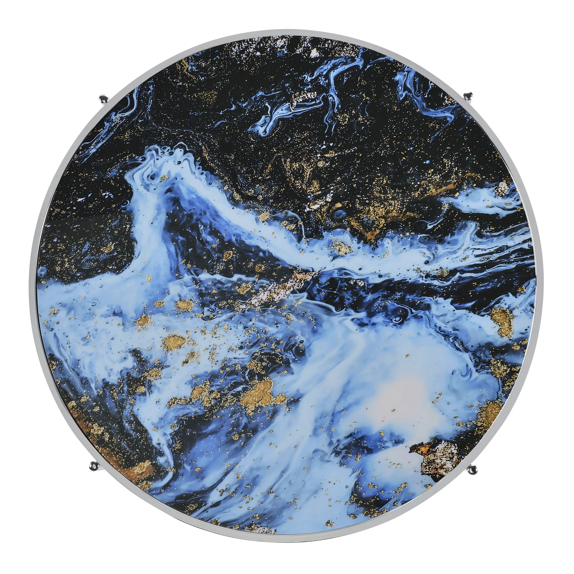 Create a modern vibe in your living room with the Averie 3-piece table set, offering a flexible cocktail table and two elegant end tables. Featuring reversible panels, each table offers two distinct looks: a clear top with a faux marble base or a faux marble top with a clear glass base. Crafted with a sleek chrome frame, these tables exude elegance with their captivating blend of blue faux marble and sparkling chrome accents. Effortlessly transform your space with this adaptable set, where style meets functionality for an unmatched experience.