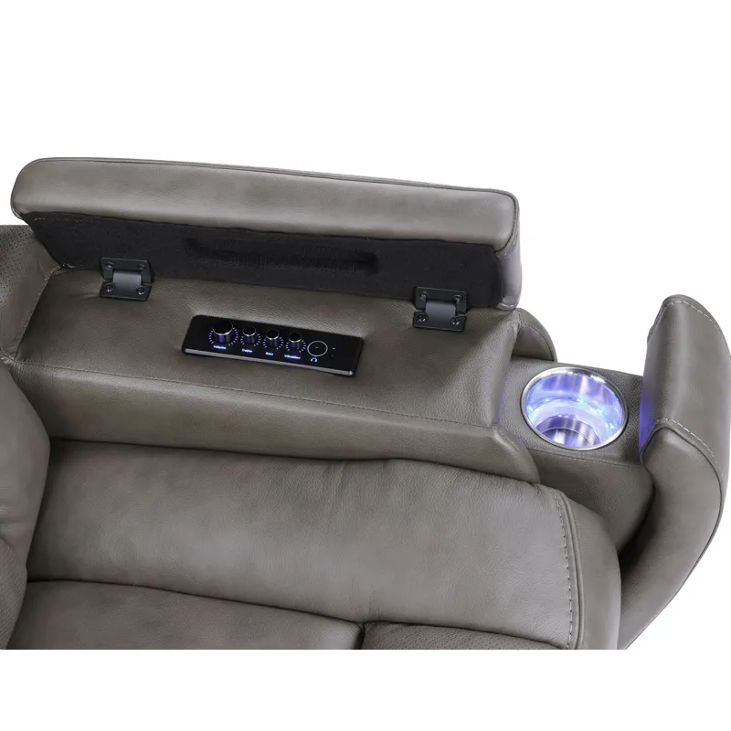 Experience the theater from the comfort of home with the Driscoll Triple-Power Leather Immersive Entertainment Recliner with Built-in Speakers. Wrapped in plush, mossy-gray leather, this recliner is designed for immersive entertainment. Built-in speakers, a subwoofer, and vibration transponders surround you with lifelike sound, while air massage and soothing heat settings add next-level relaxation. Popup arms offer convenient bass, treble and vibration control, while the outer console has USB-A &C charging, integrated lighting and programmable memory settings.