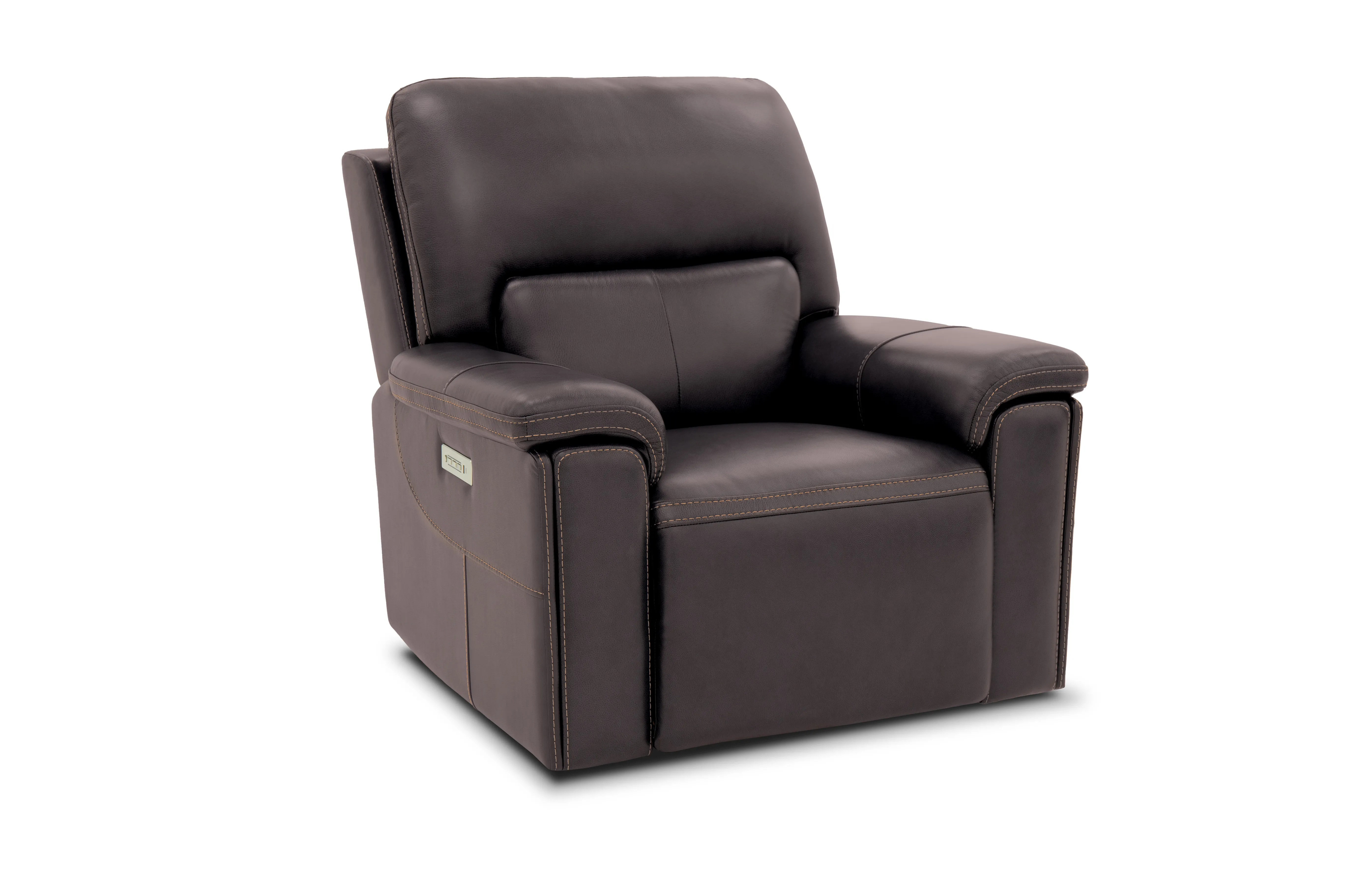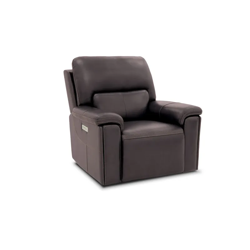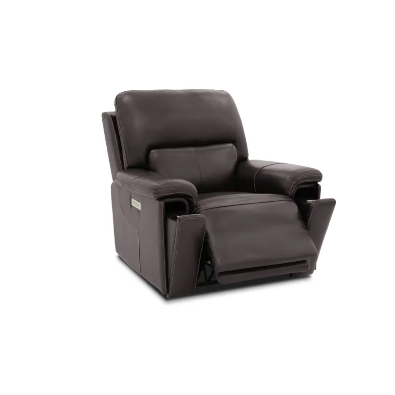 The Bastrop combines bold style with ultimate comfort. The brown leather is accented with sleek stitching. Triple power reclining includes adjustable lumbar, headrest, and footrest. USB ports, dual cup holders, and base rail lighting complete the experience.
