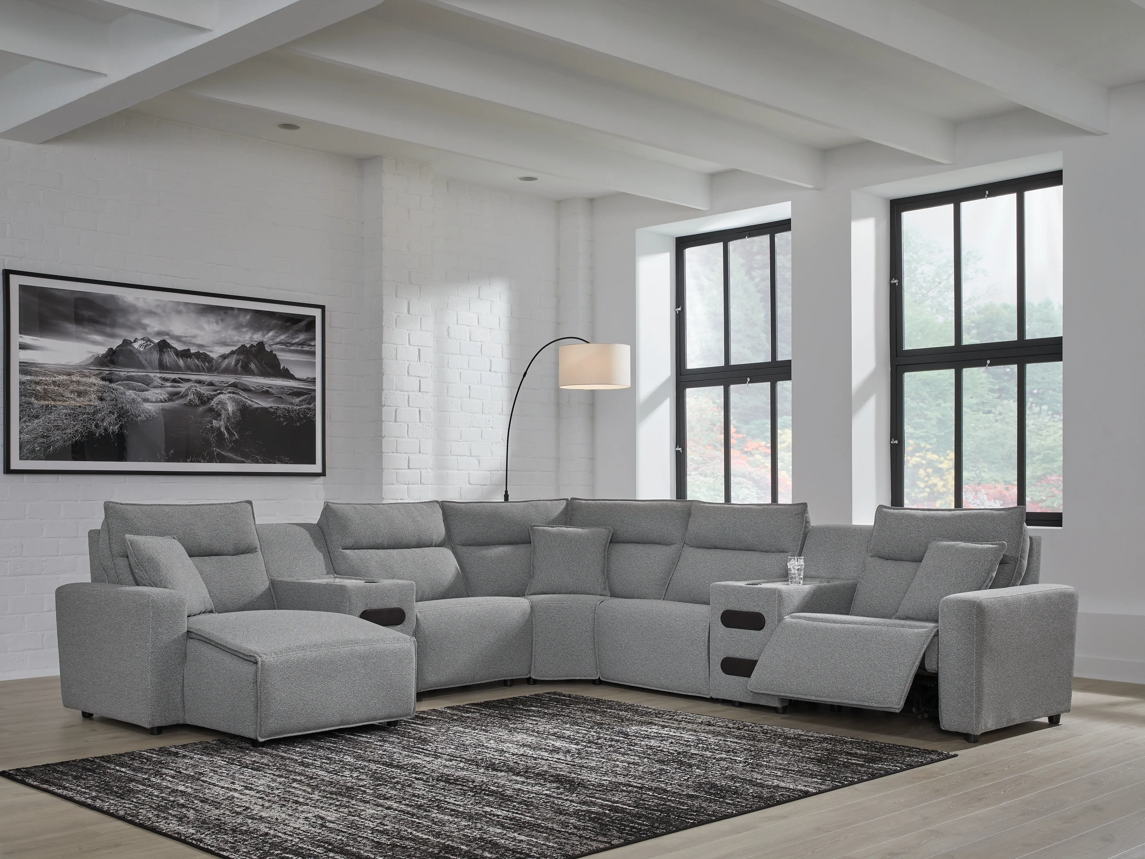 Includes 7 modular pieces: left-arm facing power reclining back chaise, power armless recliner, armless chair, 2 consoles with audio systems, wedge and right-arm facing power recliner