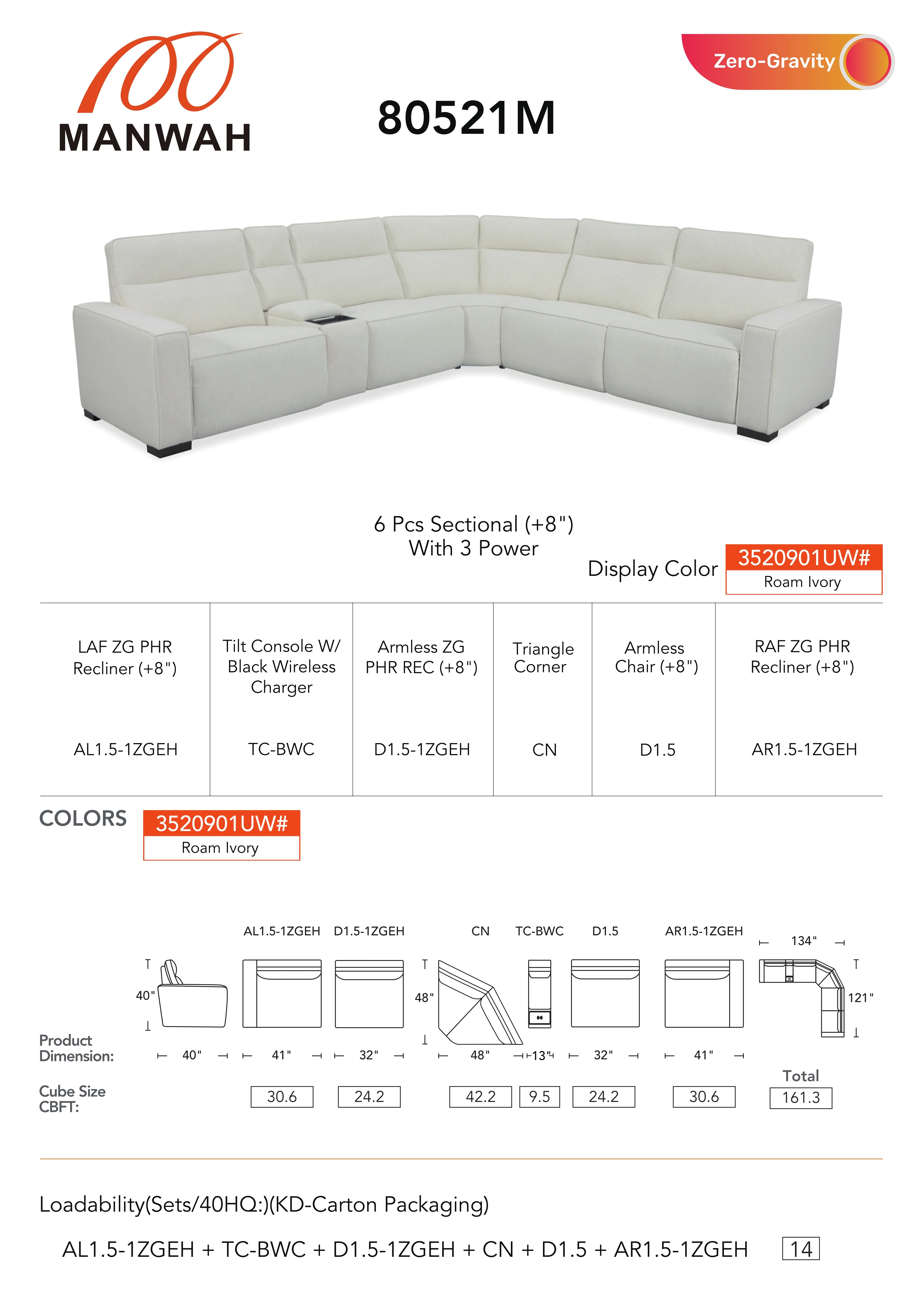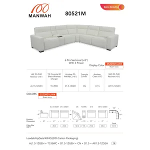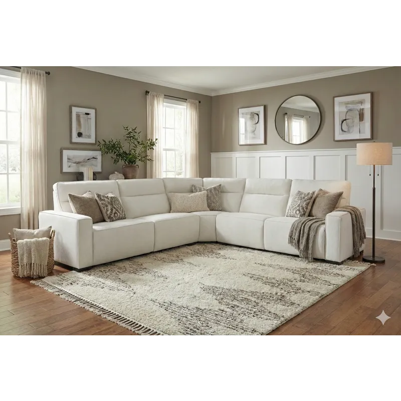 Modular Sectional totally customizable. Can we built to configure any way from Sofa to multiple seat sectional. Features Power recline and Power headrest. Stain treated performance cover. Heavy duty mechanism and solid wood frame construction 5 PC Reclining Sectional includes LAF Recliner, Armless Chair, Armless Recliner, Corner Wedge, & RAF Recliner.