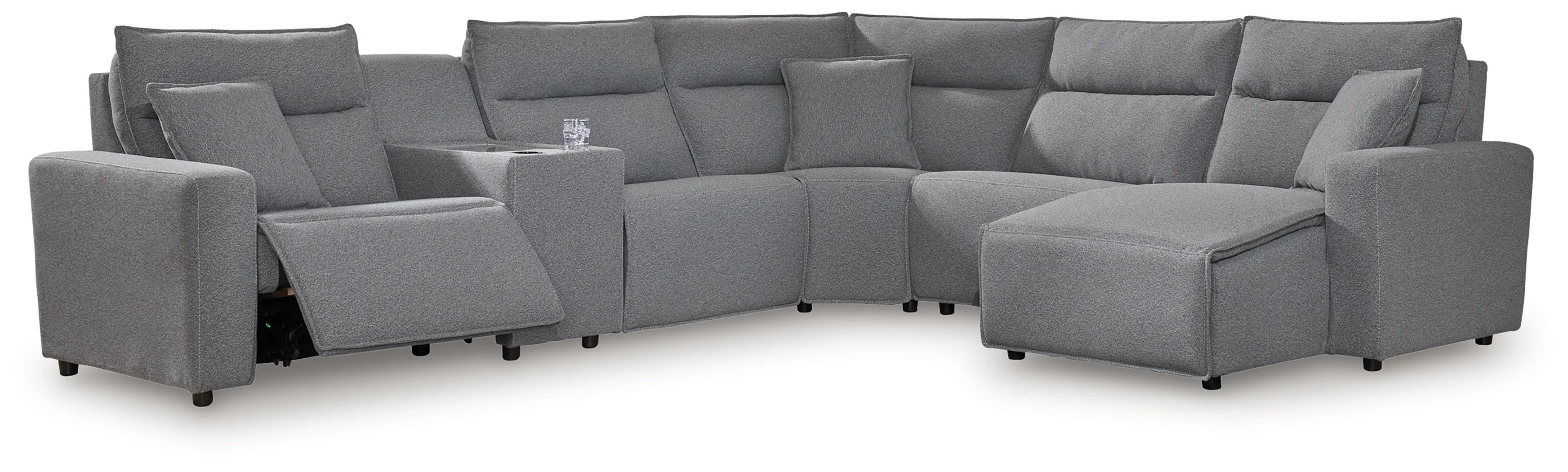 Includes 6 modular pieces: left-arm facing power recliner, power armless recliner, armless chair, console with storage, wedge and right-arm facing power reclining back chaise