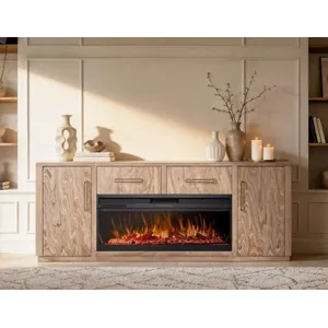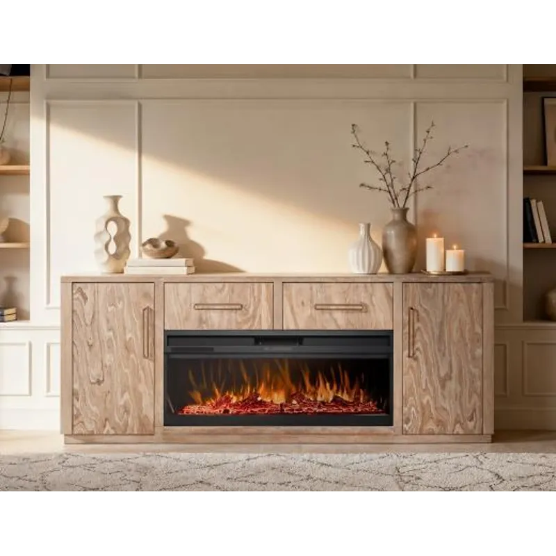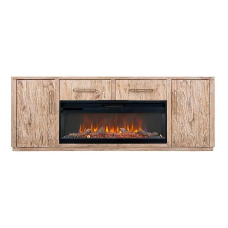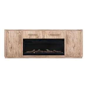 Our Balam collection is handcrafted from mango and teak wood. This simple yet stunning collection will bring an organic, modern touch to your space. This 80-inch TV stand becomes the heart of your living space, featuring two drawers and two doors for ample storage and a design that highlights the wood’s unique grain. Now enhanced with a fireplace insert, it offers not only style but also a cozy ambiance. Pair it with two matching piers to form a stunning wall unit that frames your space with harmony and sophistication. Every detail speaks of artistry, transforming your home into a sanctuary where modern design meets timeless warmth.