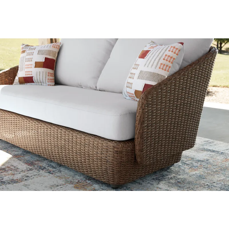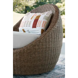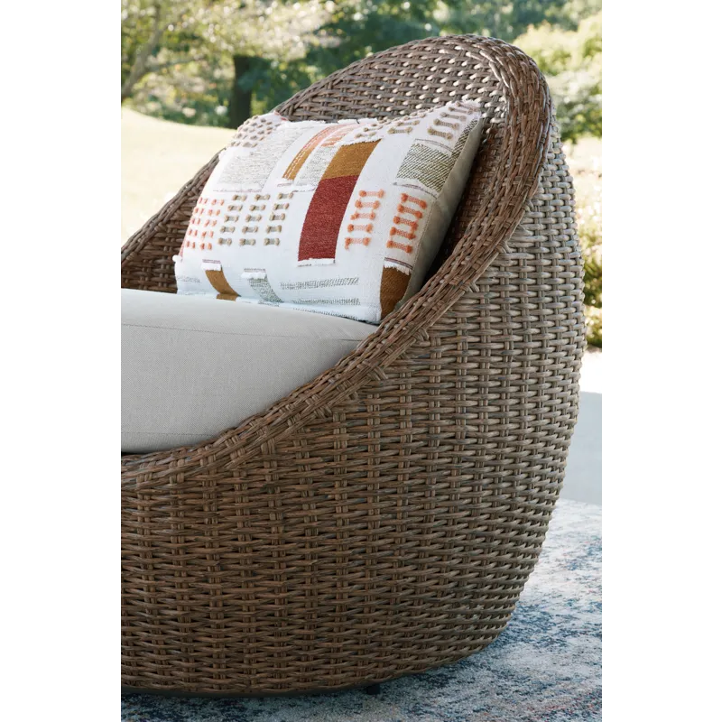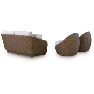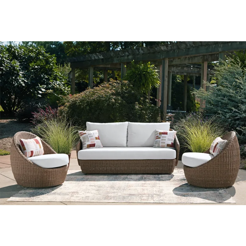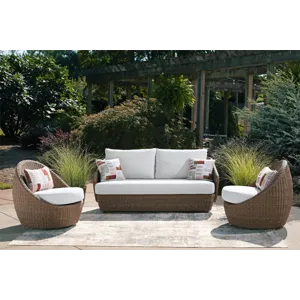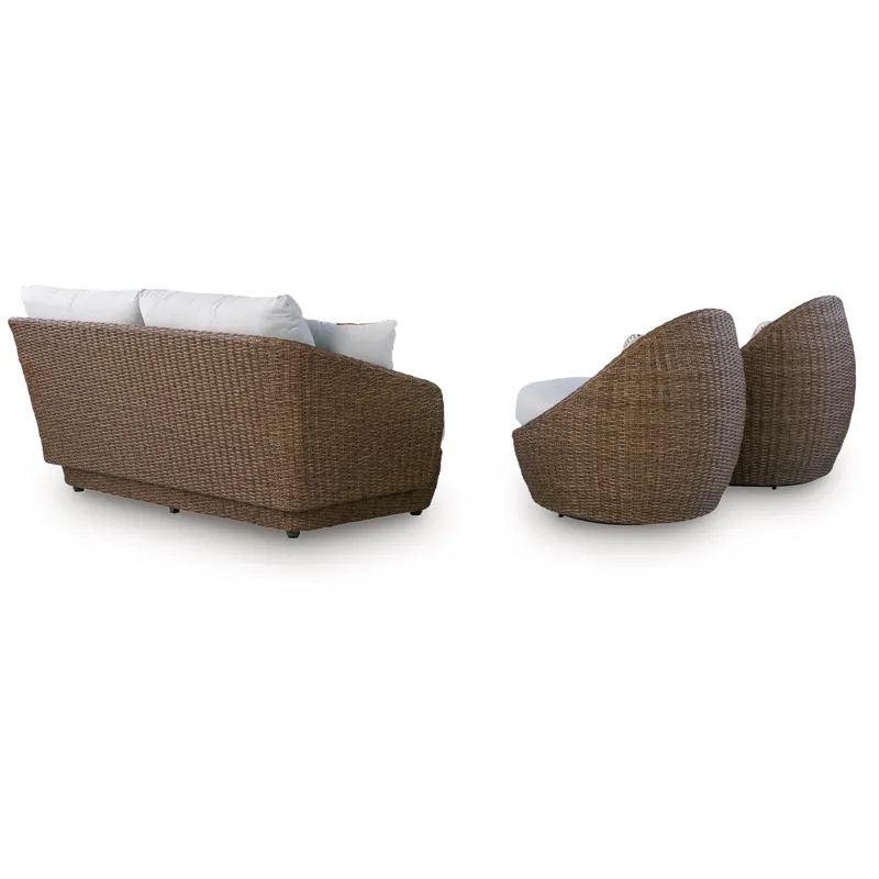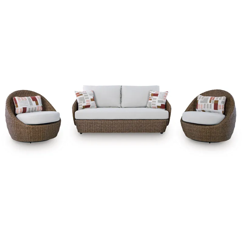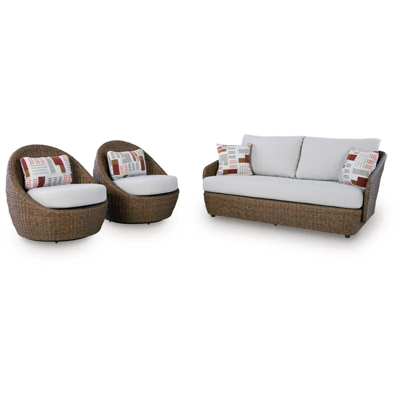 Poolside comfort and style have never been so chic. With this outdoor loveseat and swivel chairs set, lounging alfresco is effortlessly cool. The woven resin wicker combines intricate beauty with a dose of durability. High-performing fabric helps to keep pillows and cushions looking fresh over time. And with the swivel chairs' rounded silhouettes, luxe outdoor living is within easy reach.