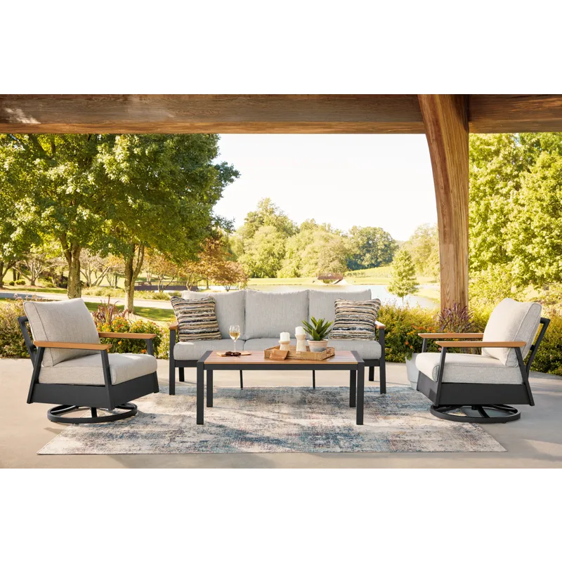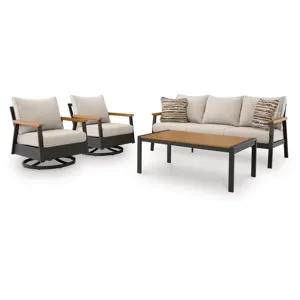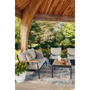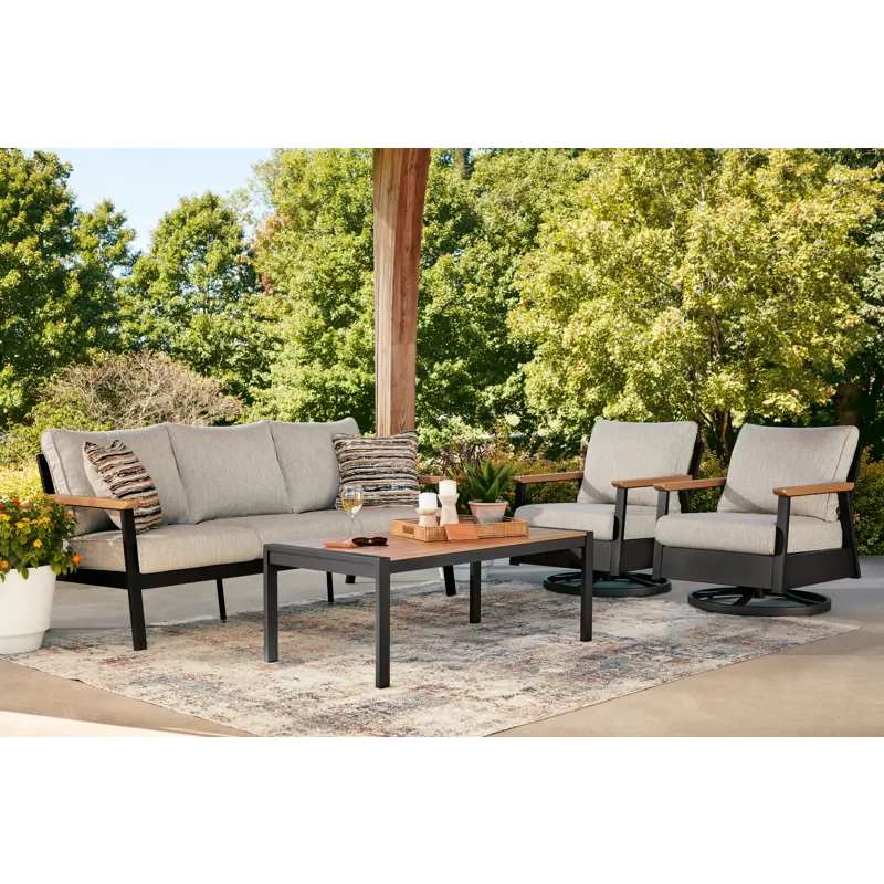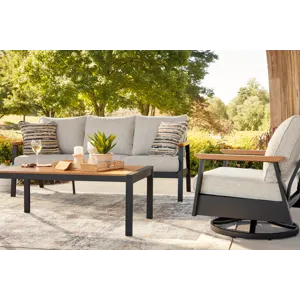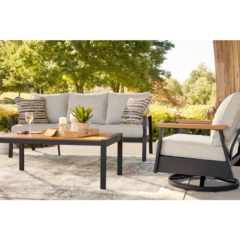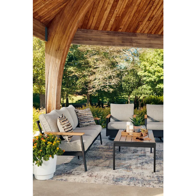 Whether you're a morning coffee on the porch person or a nighttime read on the patio person, this outdoor sofa, chair and table set brings contemporary flair to outdoor living. Its combination of wood-look aluminum and a dark brown finish lends a neutral modern appeal. Made to weather the elements, this set expertly combines the style you love with the durability you need.
